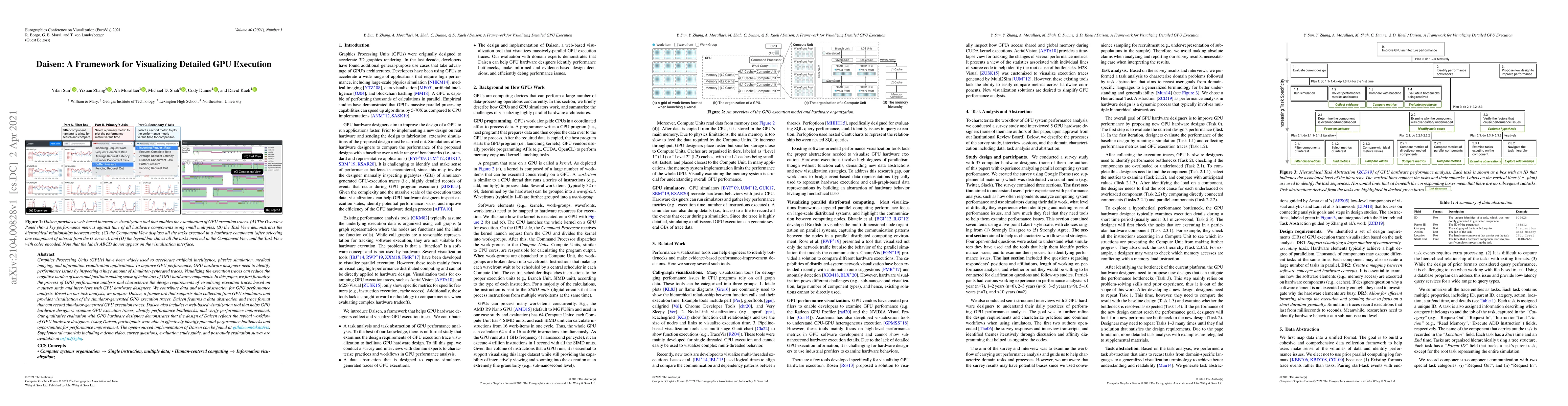 Daisen is a framework designed to visualize detailed GPU execution traces, aiding GPU hardware designers in identifying performance bottlenecks and verifying improvements. It features data abstraction, a trace format, and a web-based visualization tool, supported by qualitative evaluations showing its effectiveness in real-world scenarios.