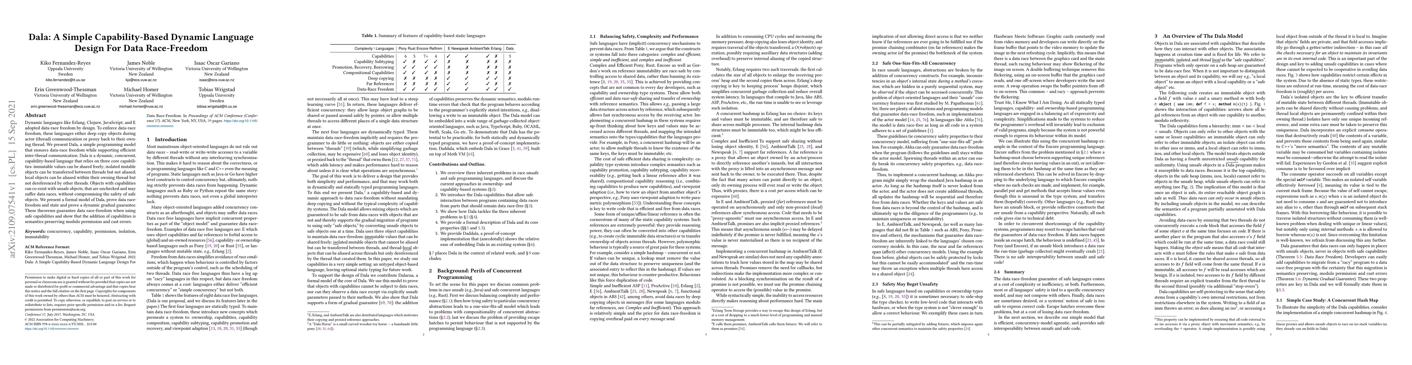 Dala is a simple, dynamic, concurrent, capability-based language designed to ensure data-race freedom through a programming model that uses three core capabilities for object management. It guarantees data race-freedom while allowing efficient inter-thread communication and coexistence of safe and unsafe objects.
