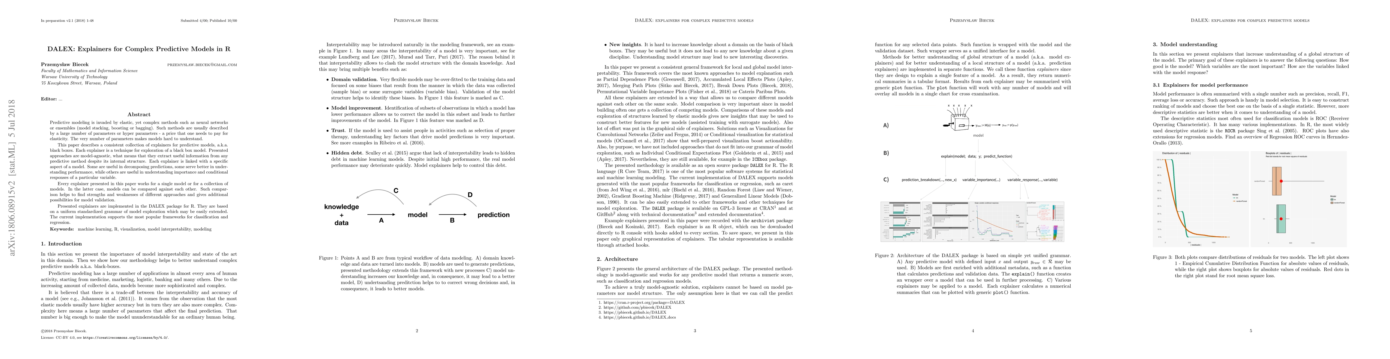 Predictive modeling is invaded by elastic, yet complex methods such as neural networks or ensembles (model stacking, boosting or bagging). Such methods are usually described by a large number of parameters or hyper parameters - a price that one needs to pay for elasticity. The very number of parameters makes models hard to understand. This paper describes a consistent collection of explainers for predictive models, a.k.a. black boxes. Each explainer is a technique for exploration of a black box model. Presented approaches are model-agnostic, what means that they extract useful information from any predictive method despite its internal structure. Each explainer is linked with a specific aspect of a model. Some are useful in decomposing predictions, some serve better in understanding performance, while others are useful in understanding importance and conditional responses of a particular variable. Every explainer presented in this paper works for a single model or for a collection of models. In the latter case, models can be compared against each other. Such comparison helps to find strengths and weaknesses of different approaches and gives additional possibilities for model validation. Presented explainers are implemented in the DALEX package for R. They are based on a uniform standardized grammar of model exploration which may be easily extended. The current implementation supports the most popular frameworks for classification and regression.