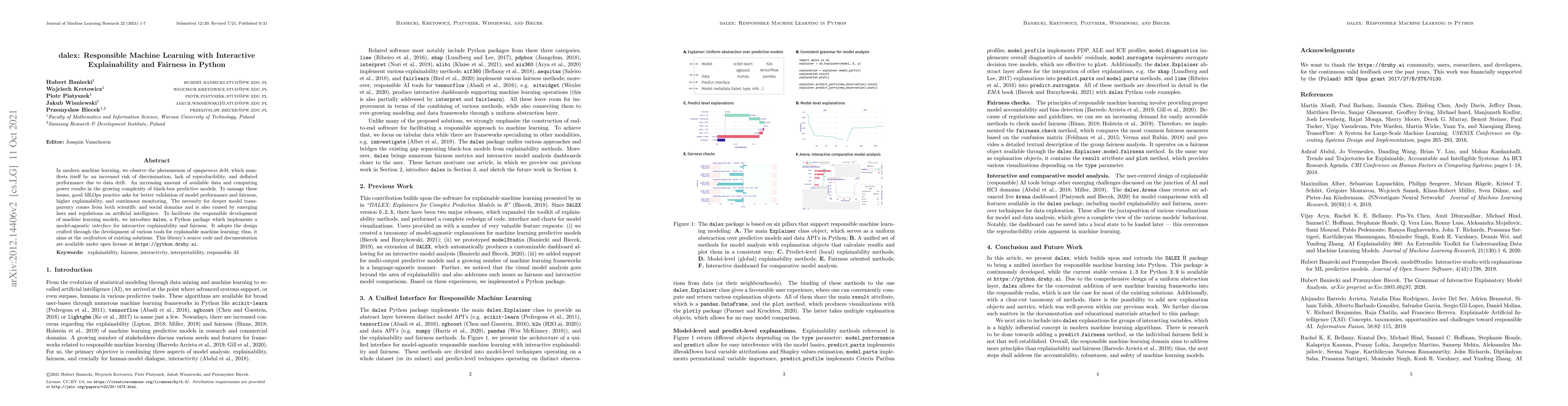 This research paper introduces dalex, a Python package that provides an interactive model exploration interface for responsible machine learning, addressing issues of model explainability and fairness.