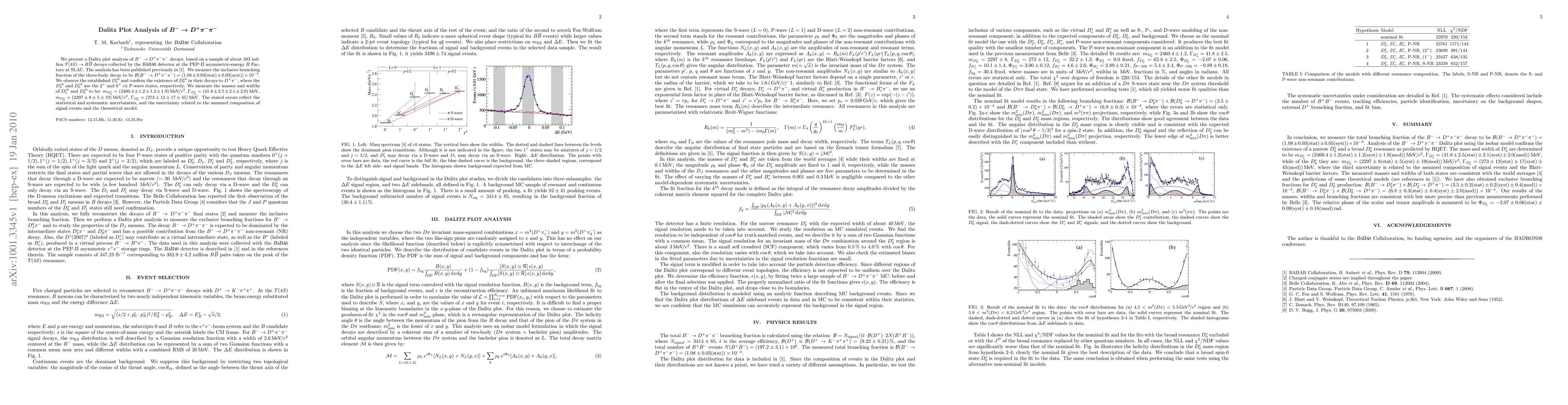 This paper reports a Dalitz plot analysis of B- --> D+ pi- pi- decays from 383 million Y(4S) --> BBbar events, measuring the branching fraction as 1.08 x 10^{-3}. It confirms the existence of D^{*0}_2 and D^{*0}_0 P-wave states and provides their masses and widths with associated uncertainties.