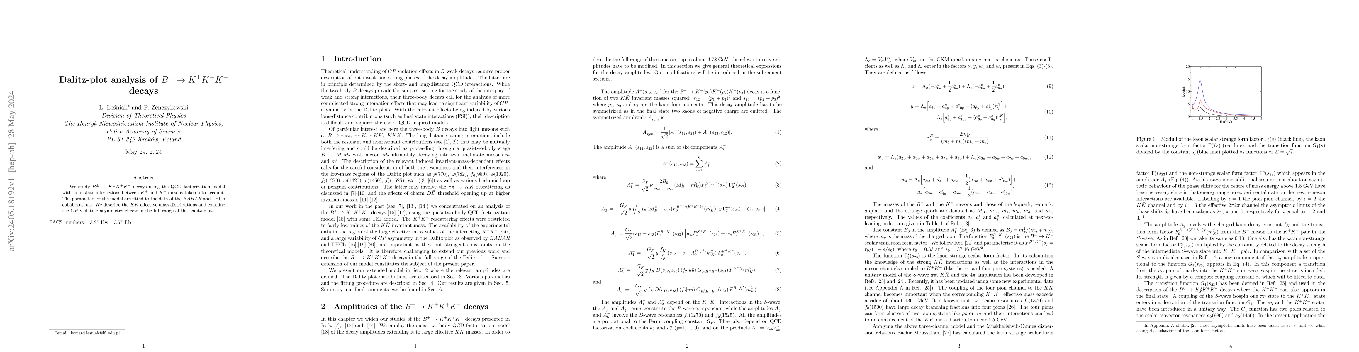 Summary: This study analyzes B+- --> K+-K+K- decays within the QCD factorization model, accounting for final state interactions, and fits model parameters to BABAR and LHCb data, exploring K Kbar mass distributions and CP-violating asymmetries across the Dalitz plot.