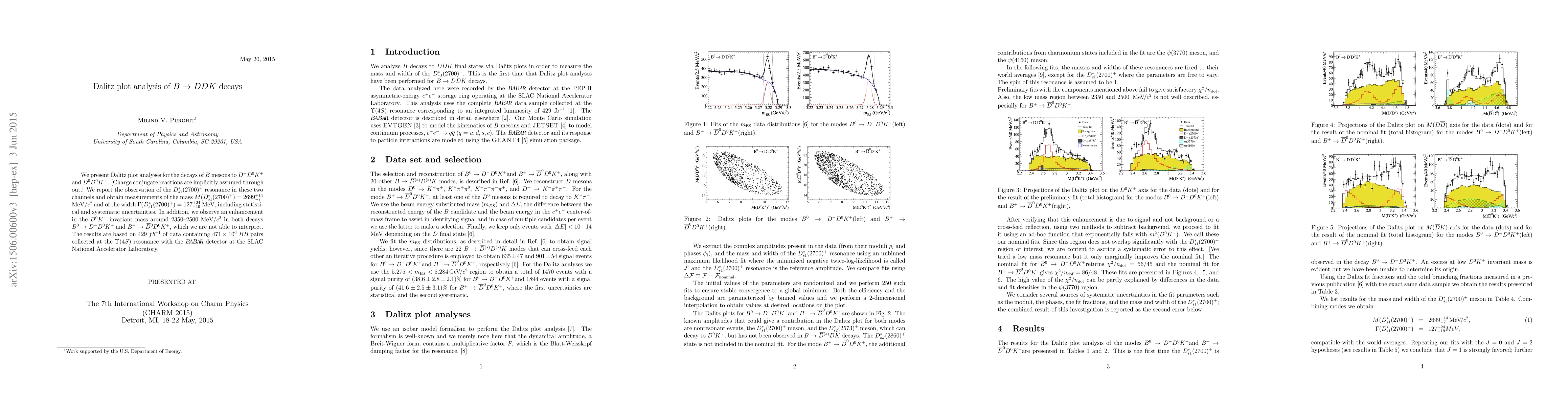Researchers observed a resonance in $B$ mesons decaying to $D^-D^0K^+$ and $ar{D}^0D^0K^+$ channels, with measurements of its mass and width. An unexplained enhancement was also detected around 2350-2500 MeV/c^2 in both decays.