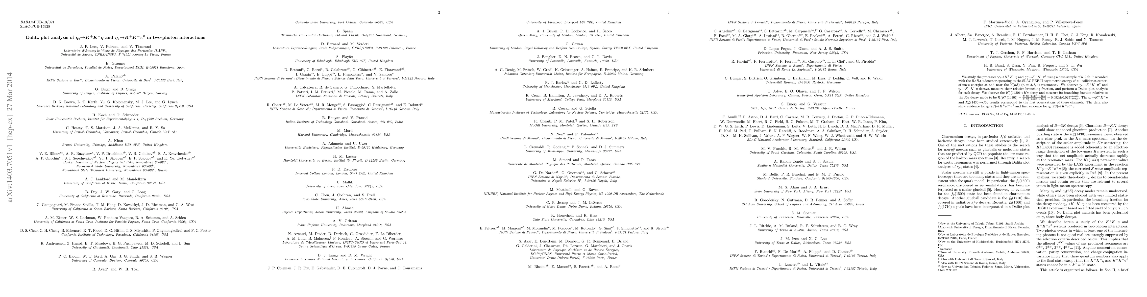We study the processes $\gamma \gamma \to K^+ K^- \eta$ and $\gamma \gamma \to K^+ K^- \pi^0$ using a data sample of 519 $fb^{-1}$ recorded with the BaBar detector operating at the SLAC PEP-II asymmetric-energy $e^+ e^-$ collider at center-of-mass energies at and near the $\Upsilon(nS)$ ($n = 2,3,4$) resonances. We observe $\eta_c \to K^+ K^- \eta$ and $\eta_c \to K^+ K^- \pi^0$ decays, measure their relative branching fraction, and perform a Dalitz plot analysis for each decay. We observe the $K^*_0(1430) \to K \eta$ decay and measure its branching fraction relative to the $K \pi$ decay mode to be ${\cal R}(K^*_0(1430)) = \frac{{\cal B}(K^*_0(1430) \to K \eta)}{{\cal B}(K^*_0(1430) \to K \pi)} = 0.092 \pm 0.025^{+0.010}_{-0.025}$. The $\eta_c \to K^+ K^- \eta$ and $K^*_0(1430) \to K \eta$ results correspond to the first observations of these channels. The data also show evidence for $\eta_c(2S) \to K^+ K^- \pi^0$ and first evidence for $\eta_c(2S) \to K^+ K^- \eta$.