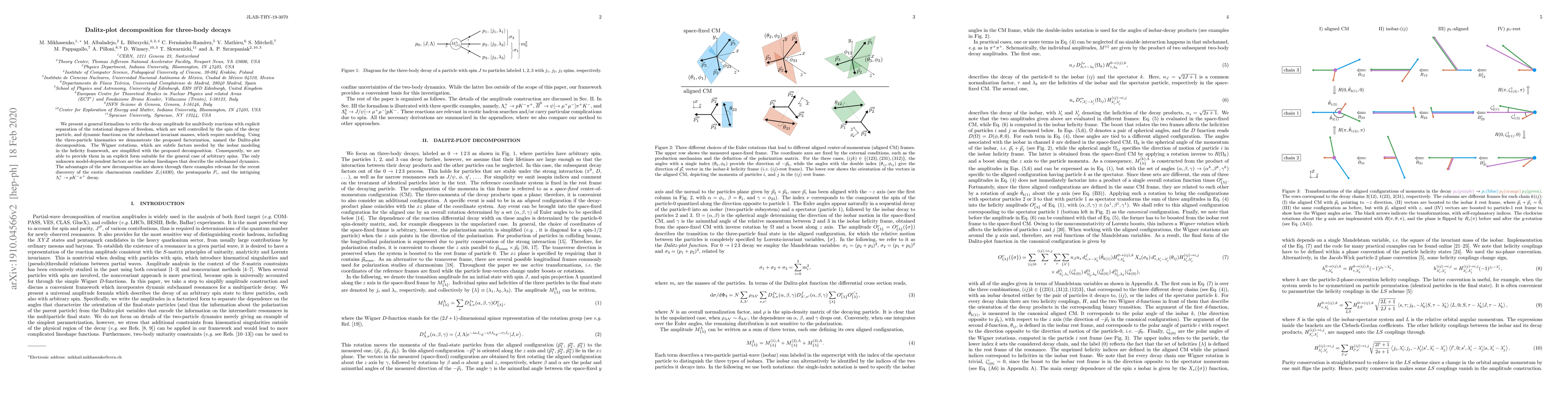 We present a general formalism to write the decay amplitude for multibody reactions with explicit separation of the rotational degrees of freedom, which are well controlled by the spin of the decay particle, and dynamic functions on the subchannel invariant masses, which require modeling. Using the three-particle kinematics we demonstrate the proposed factorization, named the Dalitz-plot decomposition. The Wigner rotations, that are subtle factors needed by the isobar modeling in the helicity framework, are simplified with the proposed decomposition. Consequently, we are able to provide them in an explicit form suitable for the general case of arbitrary spins. The only unknown model-dependent factors are the isobar lineshapes that describe the subchannel dynamics. The advantages of the new decomposition are shown through three examples relevant for the recent discovery of the exotic charmonium candidate $Z_c(4430)$, the pentaquarks $P_c$, and the intriguing $\Lambda_c^+\to pK^-\pi^+$ decay.