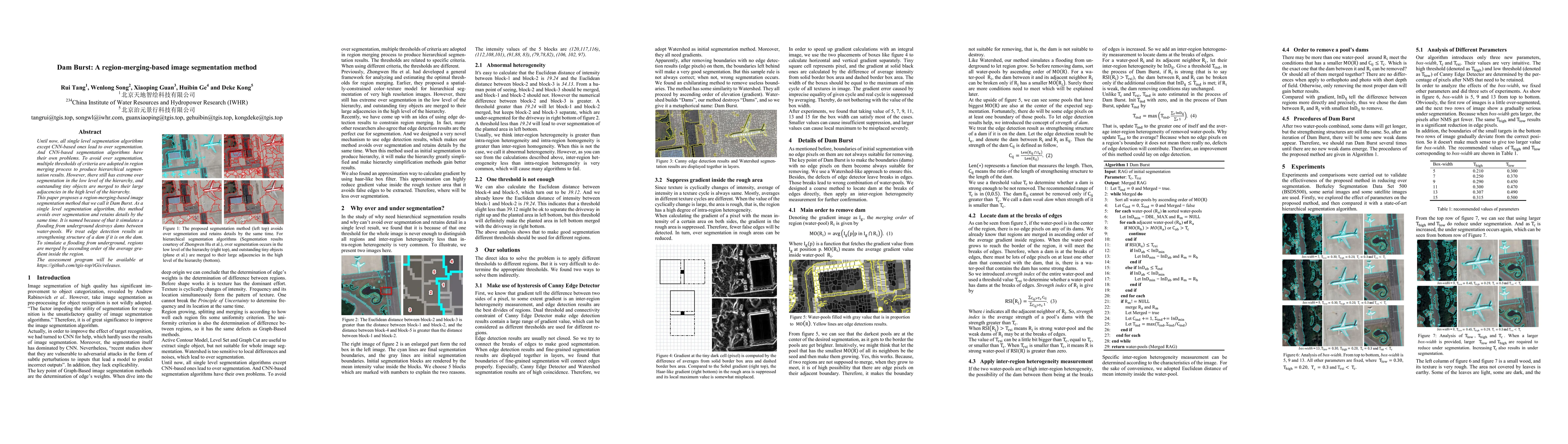 This paper introduces a new region-merging-based image segmentation method called Dam Burst, which avoids over-segmentation while retaining details. Unlike traditional methods, it merges regions by ascending average gradient, simulating a flooding process that preserves tiny objects.