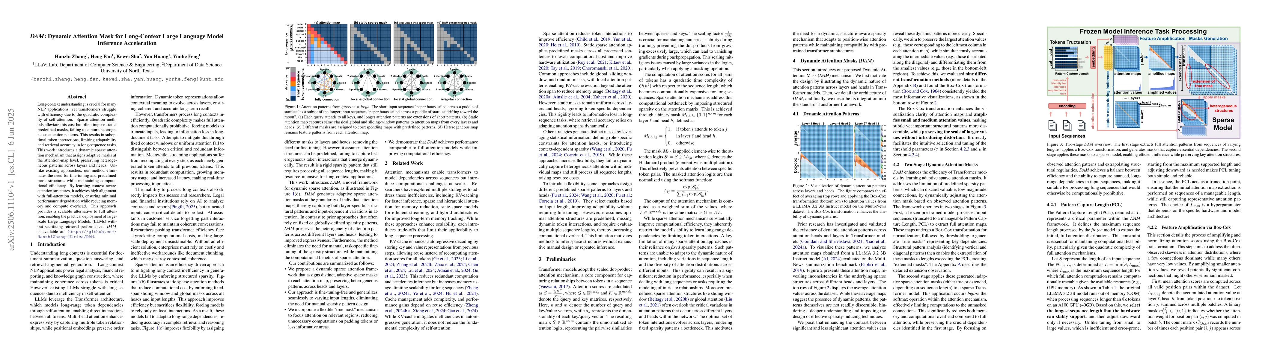Long-context understanding is crucial for many NLP applications, yet transformers struggle with efficiency due to the quadratic complexity of self-attention. Sparse attention methods alleviate this cost but often impose static, predefined masks, failing to capture heterogeneous attention patterns. This results in suboptimal token interactions, limiting adaptability and retrieval accuracy in long-sequence tasks. This work introduces a dynamic sparse attention mechanism that assigns adaptive masks at the attention-map level, preserving heterogeneous patterns across layers and heads. Unlike existing approaches, our method eliminates the need for fine-tuning and predefined mask structures while maintaining computational efficiency. By learning context-aware attention structures, it achieves high alignment with full-attention models, ensuring minimal performance degradation while reducing memory and compute overhead. This approach provides a scalable alternative to full attention, enabling the practical deployment of large-scale Large Language Models (LLMs) without sacrificing retrieval performance. DAM is available at: https://github.com/HanzhiZhang-Ulrica/DAM.