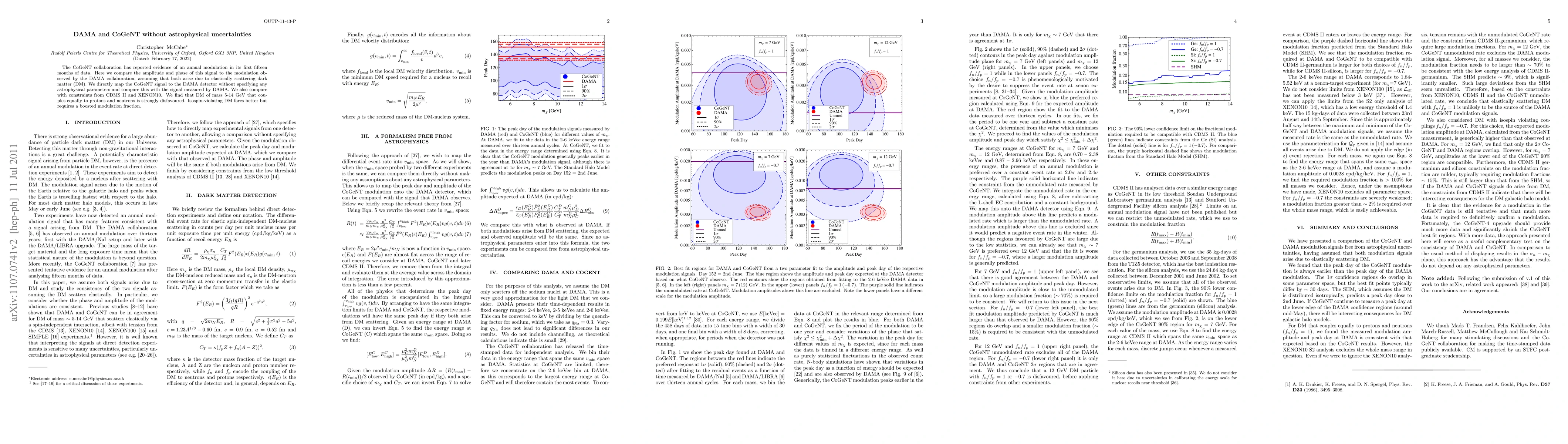 The CoGeNT collaboration has reported evidence of an annual modulation in its first fifteen months of data. Here we compare the amplitude and phase of this signal to the modulation observed by the DAMA collaboration, assuming that both arise due to elastically scattering dark matter (DM). We directly map the CoGeNT signal to the DAMA detector without specifying any astrophysical parameters and compare this with the signal measured by DAMA. We also compare with constraints from CDMS II and XENON10. We find that DM of mass 5-14 GeV that couples equally to protons and neutrons is strongly disfavoured. Isospin-violating DM fares better but requires a boosted modulation fraction.
