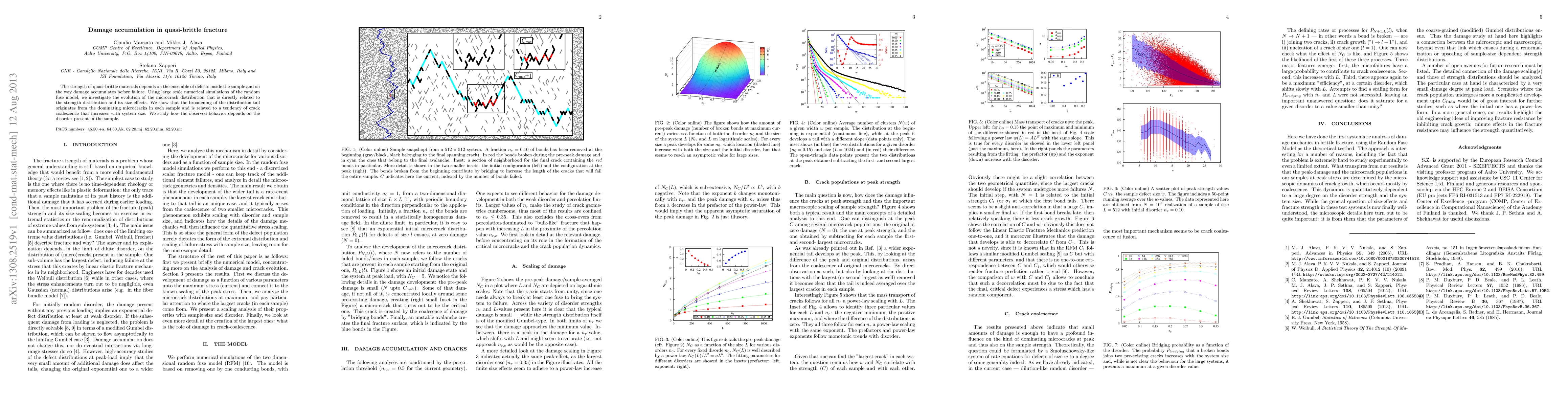 The strength of quasi-brittle materials depends on the ensemble of defects inside the sample and on the way damage accumulates before failure. Using large scale numerical simulations of the random fuse model, we investigate the evolution of the microcrack distribution that is directly related to the strength distribution and its size effects. We show that the broadening of the distribution tail originates from the dominating microcracks in each sample and is related to a tendency of crack coalescence that increases with system size. We study how the observed behavior depends on the disorder present in the sample.