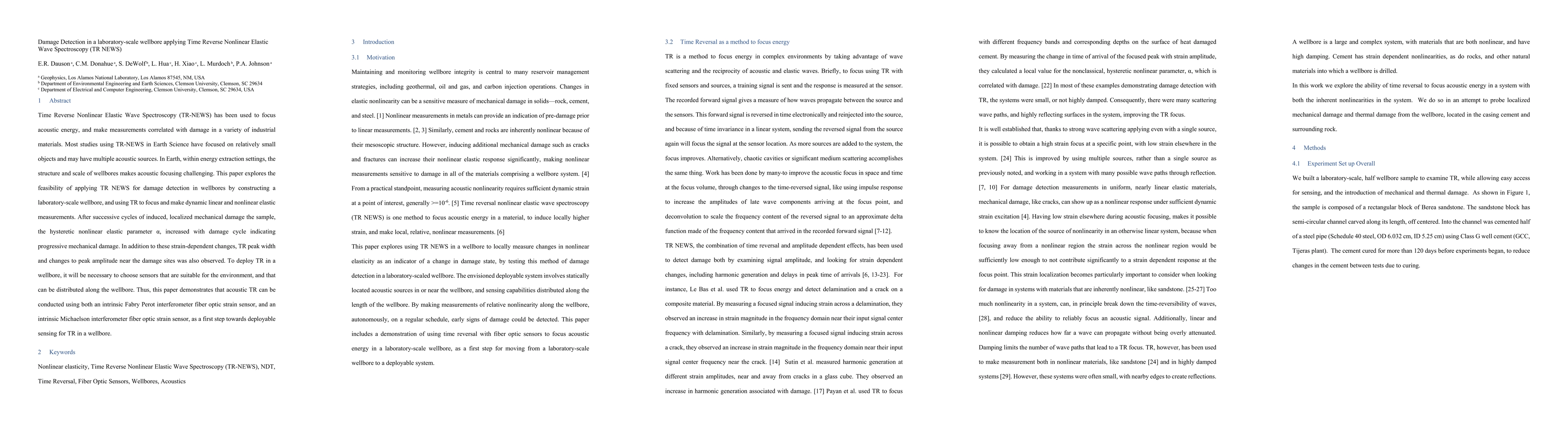 Time Reverse Nonlinear Elastic Wave Spectroscopy (TR-NEWS) has been used to focus acoustic energy, and make measurements correlated with damage in a variety of industrial materials. Most studies using TR-NEWS in Earth Science have focused on relatively small objects and may have multiple acoustic sources. In Earth, within energy extraction settings, the structure and scale of wellbores makes acoustic focusing challenging. This paper explores the feasibility of applying TR NEWS for damage detection in wellbores by constructing a laboratory-scale wellbore, and using TR to focus and make dynamic linear and nonlinear elastic measurements. After successive cycles of induced, localized mechanical damage the sample, the hysteretic nonlinear elastic parameter {\alpha}, increased with damage cycle indicating progressive mechanical damage. In addition to these strain-dependent changes, TR peak width and changes to peak amplitude near the damage sites was also observed. To deploy TR in a wellbore, it will be necessary to choose sensors that are suitable for the environment, and that can be distributed along the wellbore. Thus, this paper demonstrates that acoustic TR can be conducted using both an intrinsic Fabry Perot interferometer fiber optic strain sensor, and an intrinsic Michaelson interferometer fiber optic strain sensor, as a first step towards deployable sensing for TR in a wellbore.