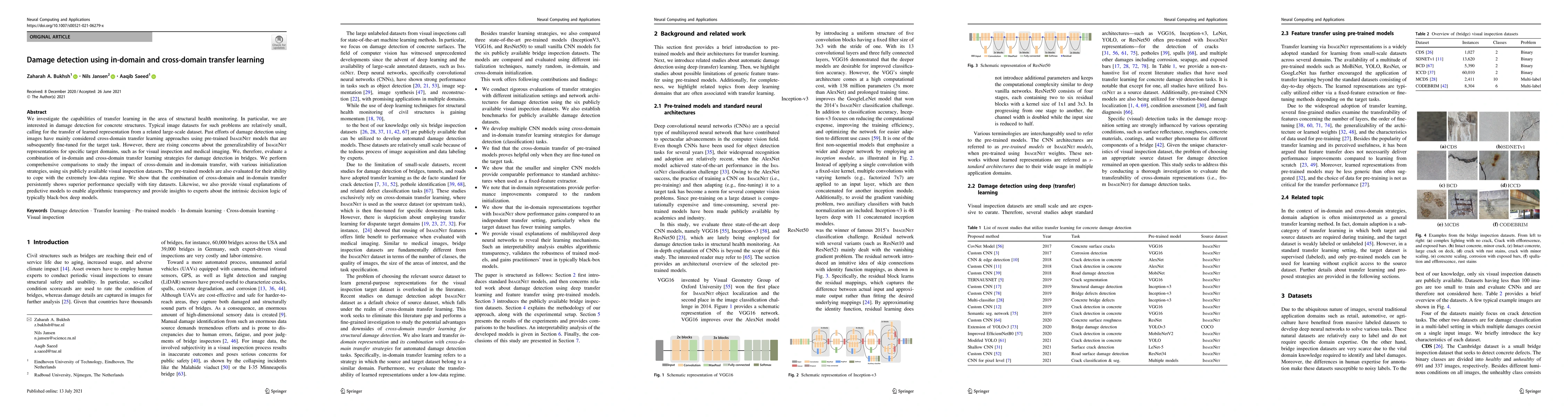 We investigate the capabilities of transfer learning in the area of structural health monitoring. In particular, we are interested in damage detection for concrete structures. Typical image datasets for such problems are relatively small, calling for the transfer of learned representation from a related large-scale dataset. Past efforts of damage detection using images have mainly considered cross-domain transfer learning approaches using pre-trained IMAGENET models that are subsequently fine-tuned for the target task. However, there are rising concerns about the generalizability of IMAGENET representations for specific target domains, such as for visual inspection and medical imaging. We, therefore, evaluate a combination of in-domain and cross-domain transfer learning strategies for damage detection in bridges. We perform comprehensive comparisons to study the impact of cross-domain and in-domain transfer, with various initialization strategies, using six publicly available visual inspection datasets. The pre-trained models are also evaluated for their ability to cope with the extremely low-data regime. We show that the combination of cross-domain and in-domain transfer persistently shows superior performance specially with tiny datasets. Likewise, we also provide visual explanations of predictive models to enable algorithmic transparency and provide insights to experts about the intrinsic decision logic of typically black-box deep models.