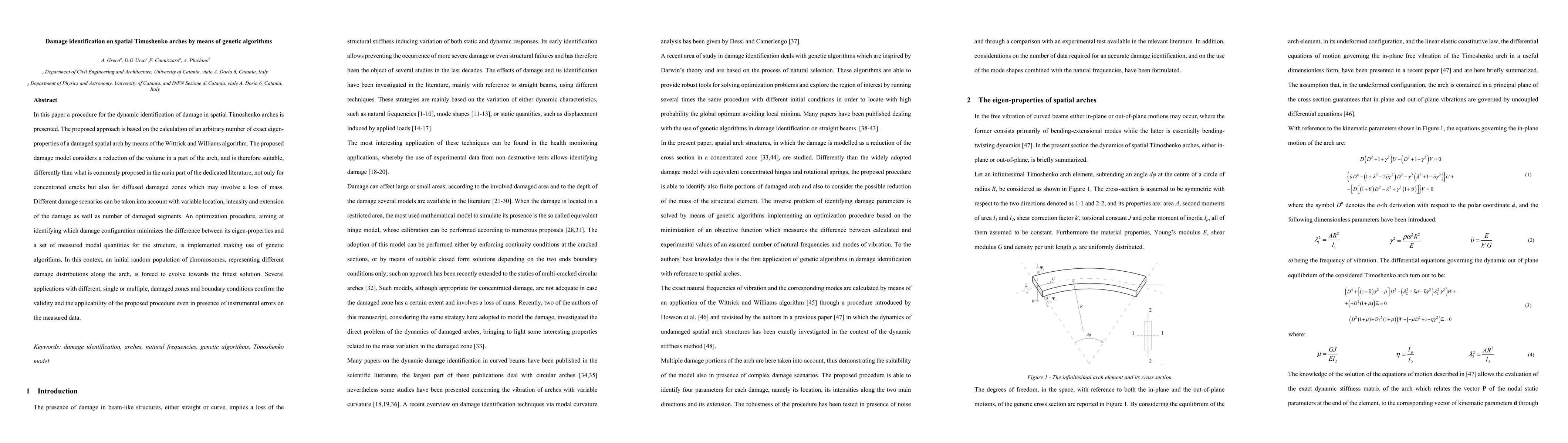 In this paper a procedure for the dynamic identification of damage in spatial Timoshenko arches is presented. The proposed approach is based on the calculation of an arbitrary number of exact eigen-properties of a damaged spatial arch by means of the Wittrick and Williams algorithm. The proposed damage model considers a reduction of the volume in a part of the arch, and is therefore suitable, differently than what is commonly proposed in the main part of the dedicated literature, not only for concentrated cracks but also for diffused damaged zones which may involve a loss of mass. Different damage scenarios can be taken into account with variable location, intensity and extension of the damage as well as number of damaged segments. An optimization procedure, aiming at identifying which damage configuration minimizes the difference between its eigen-properties and a set of measured modal quantities for the structure, is implemented making use of genetic algorithms. In this context, an initial random population of chromosomes, representing different damage distributions along the arch, is forced to evolve towards the fittest solution. Several applications with different, single or multiple, damaged zones and boundary conditions confirm the validity and the applicability of the proposed procedure even in presence of instrumental errors on the measured data.
