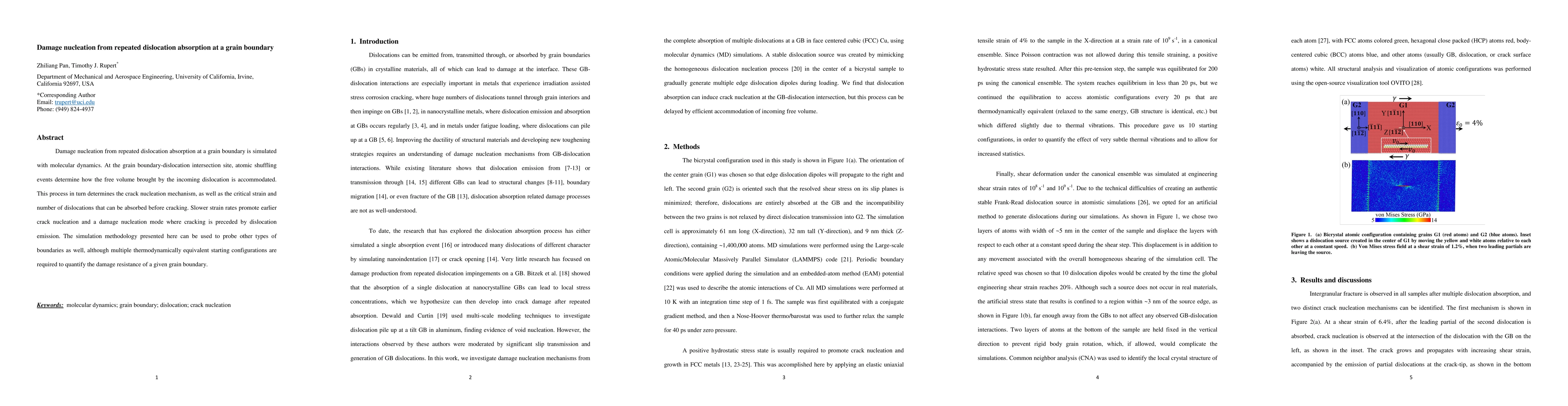 This paper uses molecular dynamics to simulate damage nucleation from repeated dislocation absorption at grain boundaries, revealing that atomic shuffling events determine crack nucleation mechanisms and critical strain. Slower strain rates lead to earlier crack nucleation preceded by dislocation emission.