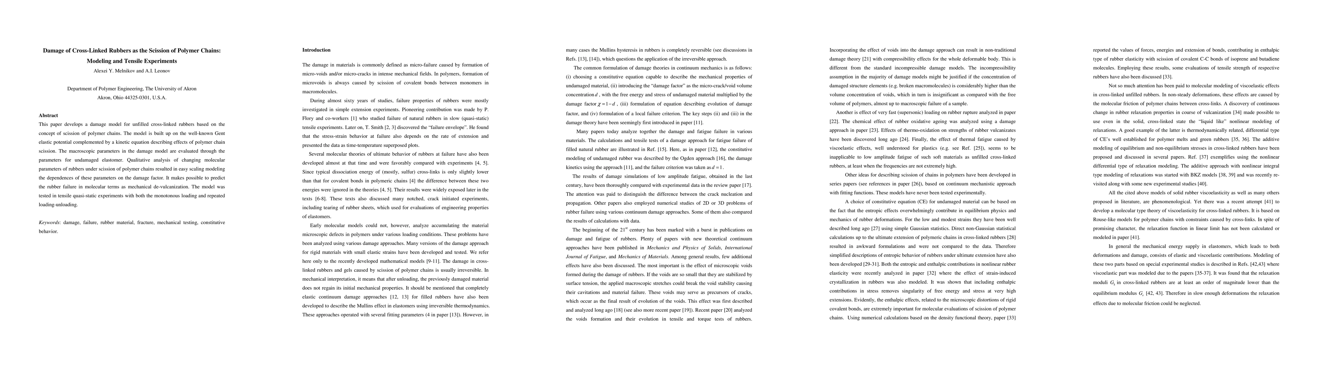This paper proposes a damage model for unfilled cross-linked rubbers based on polymer chain scission, integrating the Gent elastic potential with a kinetic equation. The model's parameters are calibrated using undamaged elastomer properties, and it predicts rubber failure as mechanical de-vulcanization, validated through tensile experiments.