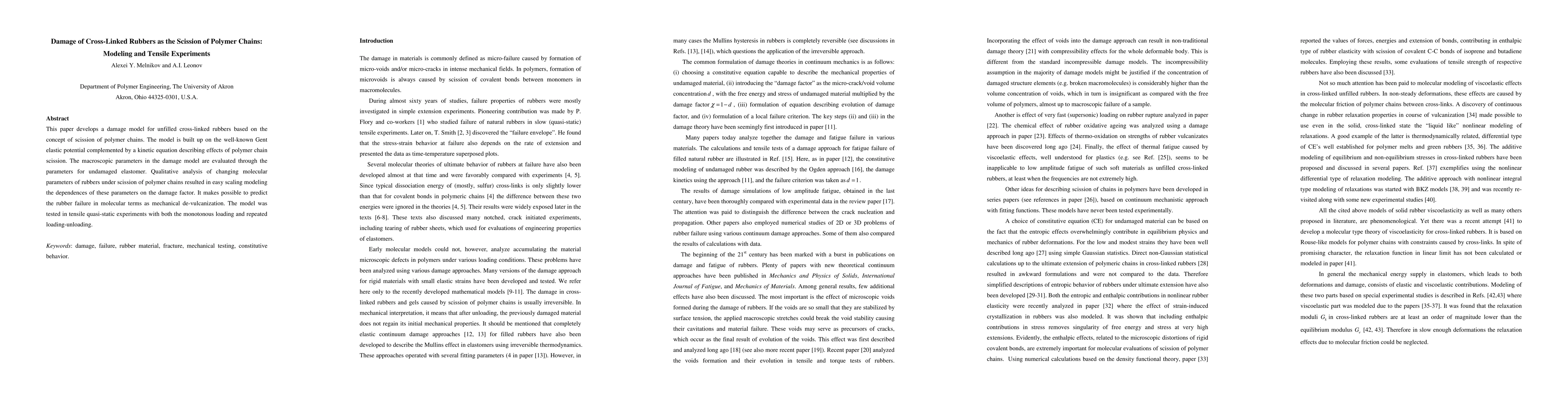 This paper develops a damage model for unfilled cross-linked rubbers based on the concept of scission of polymer chains. The model is built up on the well-known Gent elastic potential complemented by a kinetic equation describing effects of polymer chain scission. The macroscopic parameters in the damage model are evaluated through the parameters for undamaged elastomer. Qualitative analysis of changing molecular parameters of rubbers under scission of polymer chains resulted in easy scaling modeling the dependences of these parameters on the damage factor. It makes possible to predict the rubber failure in molecular terms as mechanical de-vulcanization. The model was tested in tensile quasi-static experiments with both the monotonous loading and repeated loading-unloading.