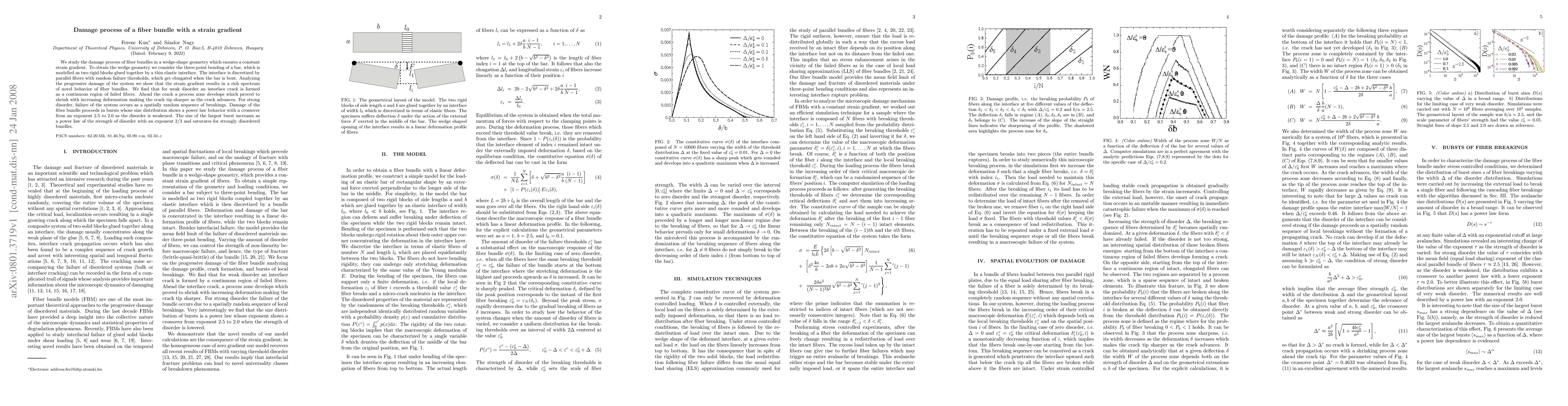 This paper investigates the damage process in fiber bundles under a constant strain gradient, modeled by three-point bending of a bar with a thin elastic interface. It reveals that weak disorder leads to a continuous crack with a shrinking process zone, while strong disorder causes random fiber failure in bursts, transitioning from a power law size distribution.