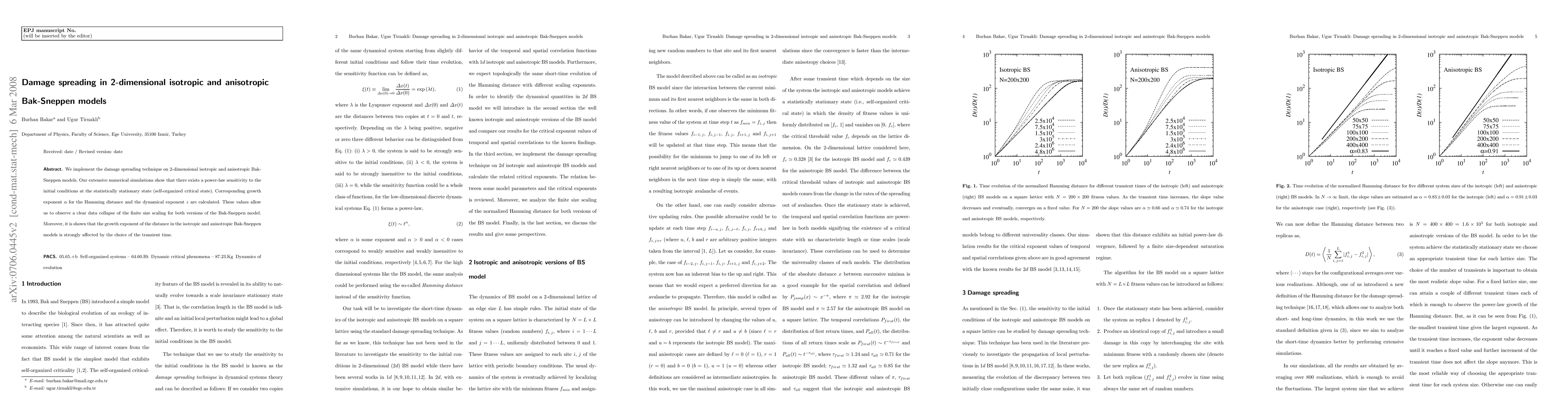 We implement the damage spreading technique on 2-dimensional isotropic and anisotropic Bak-Sneppen models. Our extensive numerical simulations show that there exists a power-law sensitivity to the initial conditions at the statistically stationary state (self-organized critical state). Corresponding growth exponent $\alpha$ for the Hamming distance and the dynamical exponent $z$ are calculated. These values allow us to observe a clear data collapse of the finite size scaling for both versions of the Bak-Sneppen model. Moreover, it is shown that the growth exponent of the distance in the isotropic and anisotropic Bak-Sneppen models is strongly affected by the choice of the transient time.