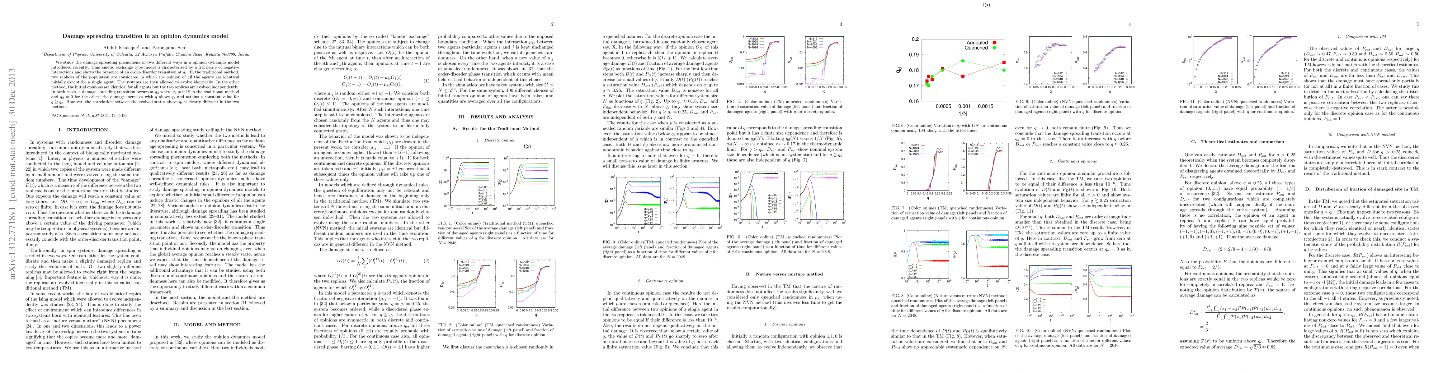 We study the damage spreading phenomena in two different ways in a opinion dynamics model introduced recently. This kinetic exchange type model is characterized by a fraction $q$ of negative interactions and shows the presence of an order-disorder transition at $q_c$. In the traditional method, two replicas of the population are considered in which the opinion of all the agents are identical initially except for a single agent. The systems are then allowed to evolve identically. In the other method, the initial opinions are identical for all agents but the two replicas are evolved independently. In both cases, a damage spreading transition occurs at $q_d$ where $q_d \approx 0.18$ in the traditional method and $q_d =0$ for the other; the damage increases with $q$ above $q_d$ and attains a constant value for $q\geq q_c$. However, the correlation between the evolved states above $q_c$ is clearly different in the two methods.