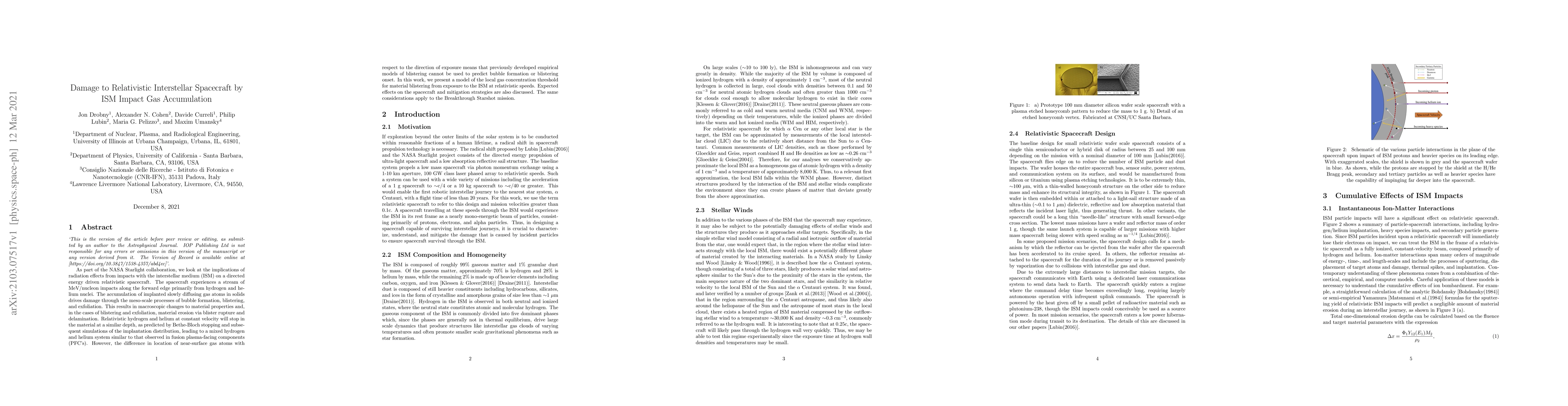 This study investigates the damage to relativistic interstellar spacecraft from impacts with interstellar medium (ISM) gas, focusing on hydrogen and helium nuclei. It models the meso-scale processes causing bubble formation and blistering, leading to material erosion, and proposes a new threshold model for predicting blistering onset. Mitigation strategies are also discussed for missions like NASA's Starlight and Breakthrough Starshot.