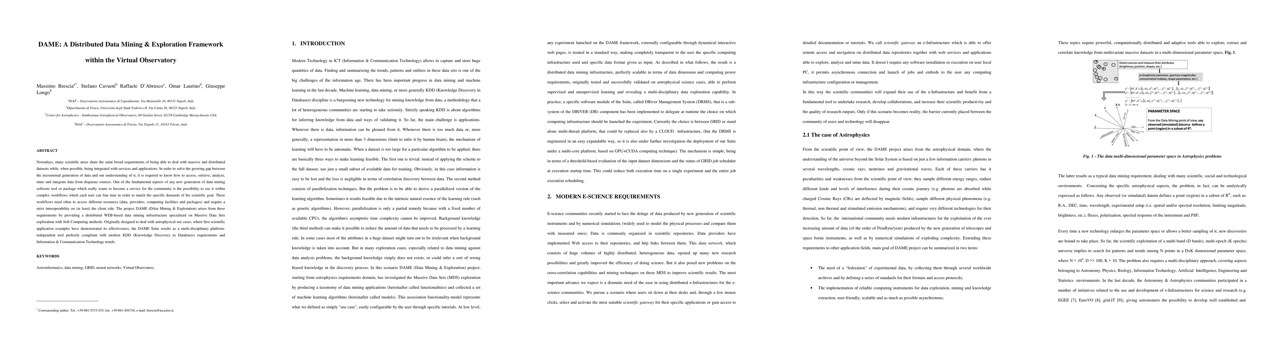 The DAME framework offers a distributed, web-based data mining infrastructure for exploring massive datasets, particularly in astrophysics, utilizing soft computing methods. It is designed to integrate seamlessly into complex workflows, enabling interoperability across diverse data resources and computing facilities.