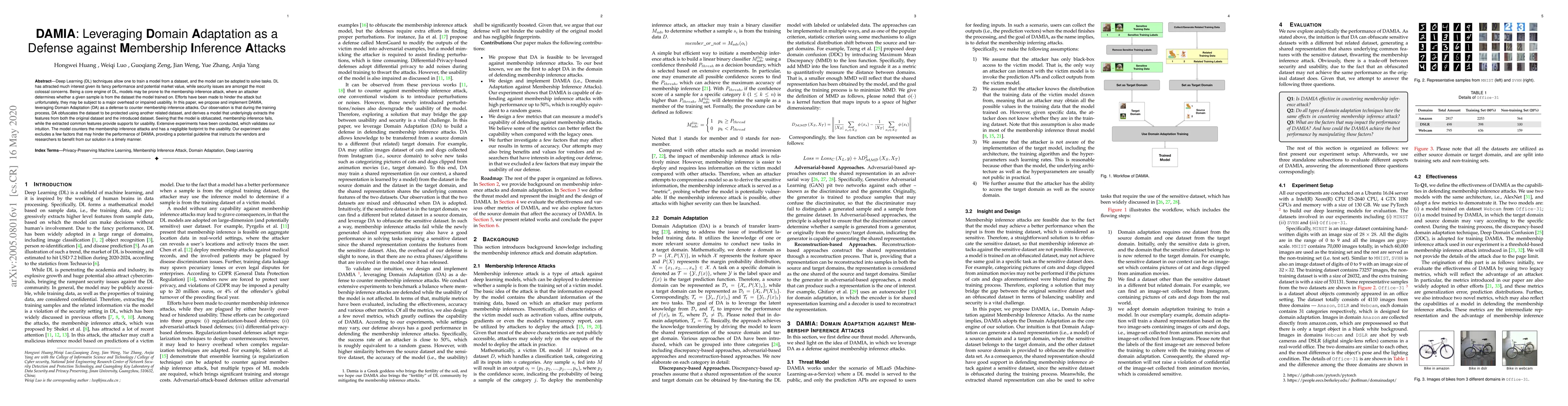 DAMIA proposes a defense against membership inference attacks using Domain Adaptation, which obfuscates training data to protect it from being identified by attackers while preserving usability. Extensive experiments validate the solution's effectiveness with negligible impact on performance.