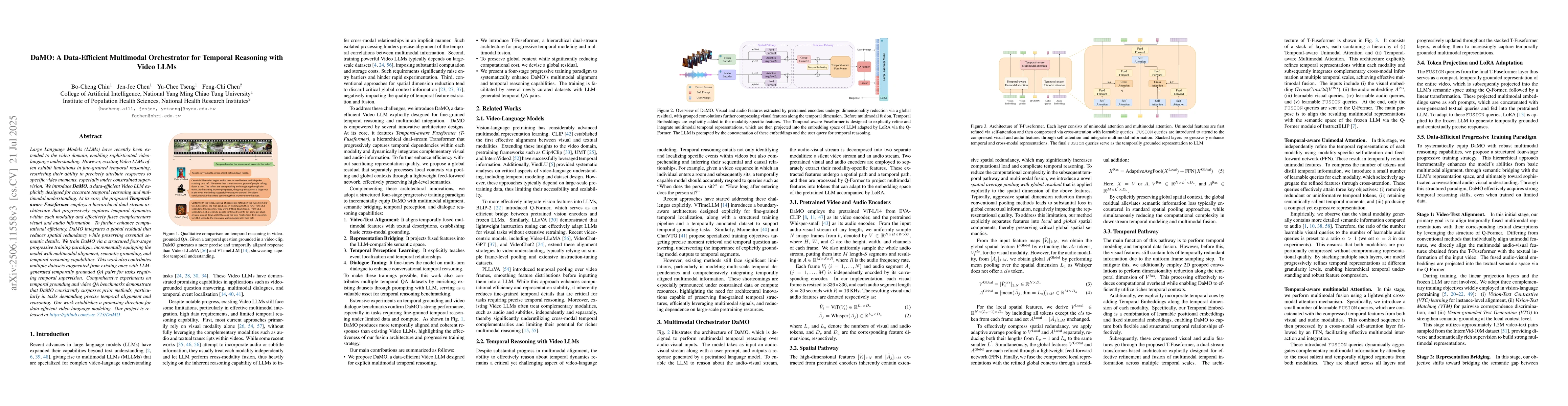 The paper introduces DaMO, a data-efficient Video LLM designed for precise temporal reasoning and multimodal understanding. It uses a Temporal-aware Fuseformer with a dual-stream architecture and global residual for efficiency, trained in a four-stage progressive paradigm. DaMO outperforms prior methods in tasks requiring temporal alignment and reasoning, contributing new datasets for temporal supervision.