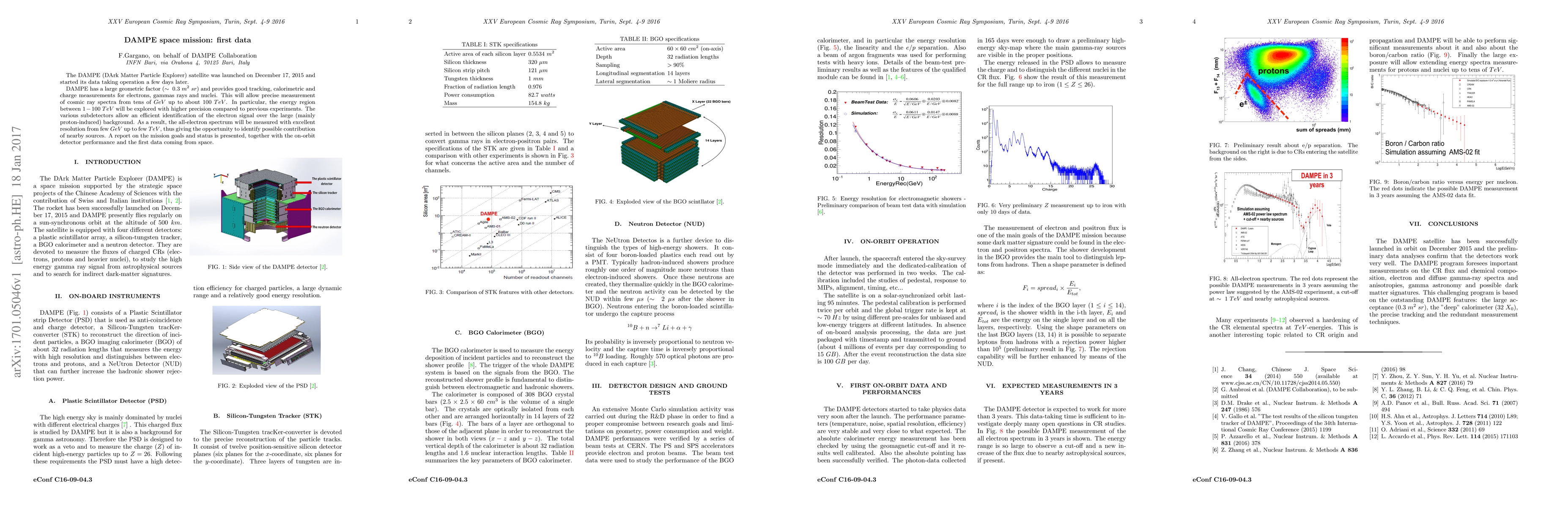 The DAMPE satellite launched in December 2015 aims to precisely measure cosmic ray spectra from tens of GeV to 100 TeV, with particular focus on the 1-100 TeV range. Initial data indicates excellent performance and resolution in identifying electron signals amidst a proton-induced background.