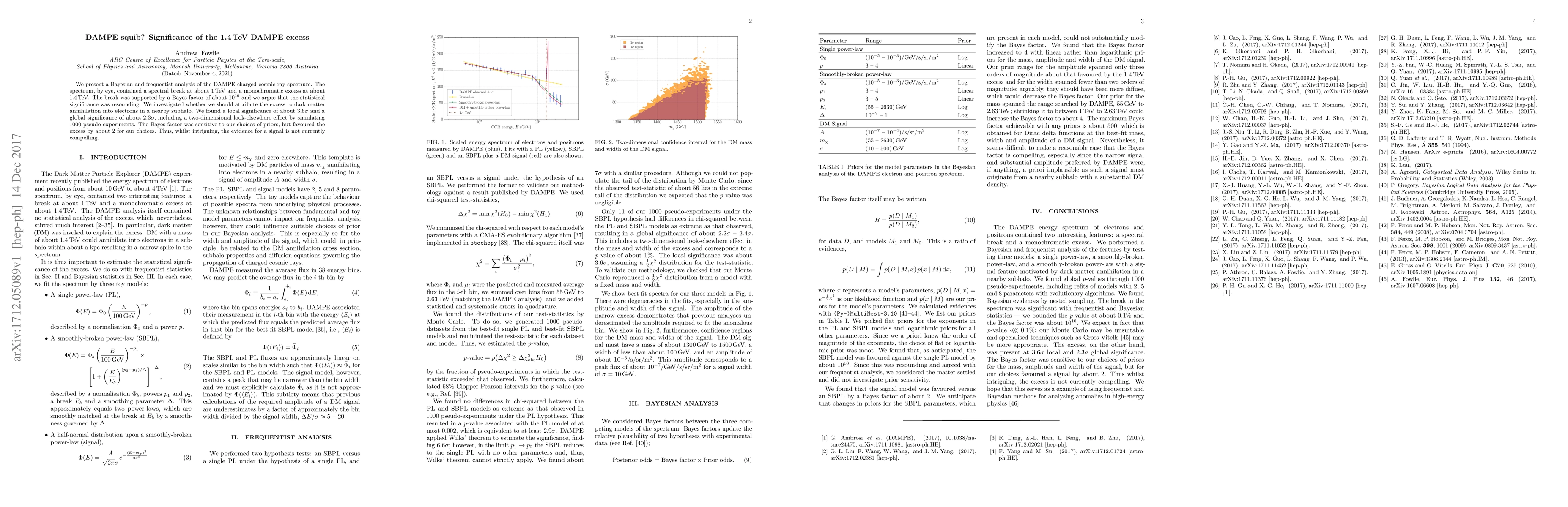 We present a Bayesian and frequentist analysis of the DAMPE charged cosmic ray spectrum. The spectrum, by eye, contained a spectral break at about 1 TeV and a monochromatic excess at about 1.4 TeV. The break was supported by a Bayes factor of about $10^{10}$ and we argue that the statistical significance was resounding. We investigated whether we should attribute the excess to dark matter annihilation into electrons in a nearby subhalo. We found a local significance of about $3.6\sigma$ and a global significance of about $2.3\sigma$, including a two-dimensional look-elsewhere effect by simulating 1000 pseudo-experiments. The Bayes factor was sensitive to our choices of priors, but favoured the excess by about 2 for our choices. Thus, whilst intriguing, the evidence for a signal is not currently compelling.
