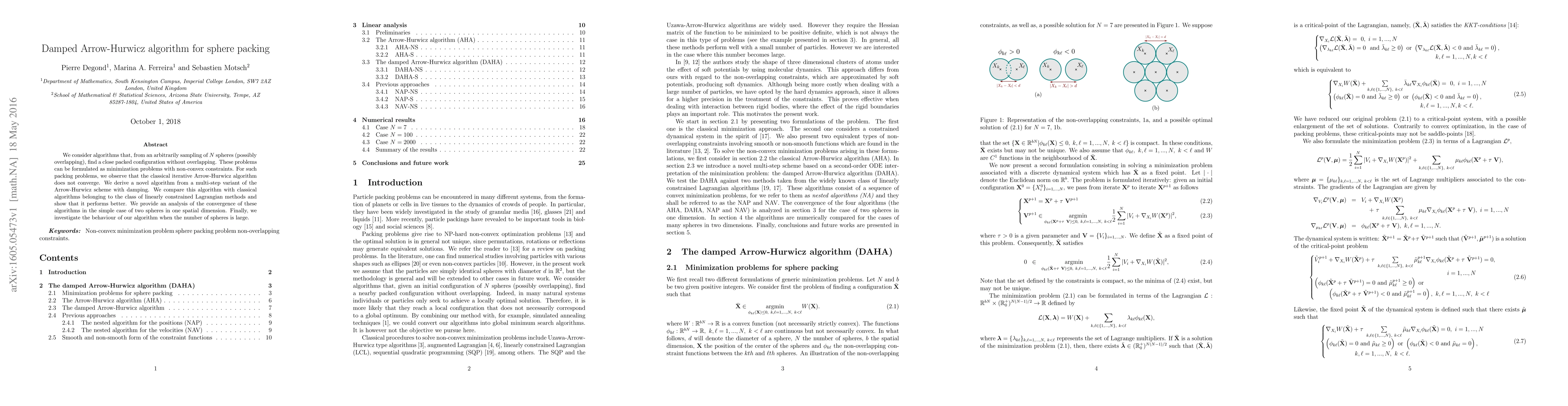 This paper introduces a damped variant of the Arrow-Hurwicz algorithm for finding non-overlapping sphere packing configurations from an arbitrary sample. It demonstrates superior performance compared to classical linearly constrained Lagrangian methods and analyzes convergence in simple cases and large-scale scenarios.