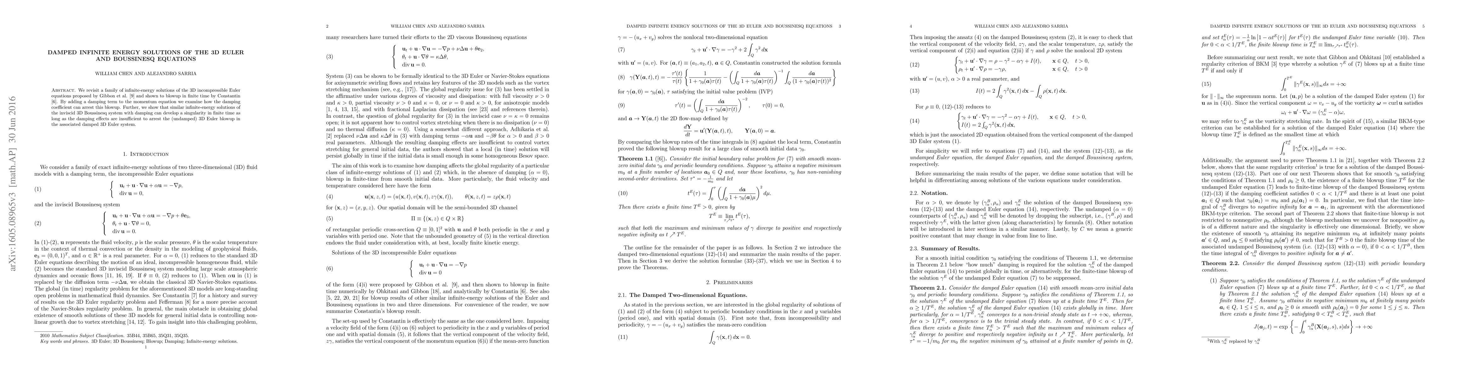 We revisit a family of infinite-energy solutions of the 3D incompressible Euler equations proposed by Gibbon et al. [9] and shown to blowup in finite time by Constantin [6]. By adding a damping term to the momentum equation we examine how the damping coefficient can arrest this blowup. Further, we show that similar infinite-energy solutions of the inviscid 3D Boussinesq system with damping can develop a singularity in finite time as long as the damping effects are insufficient to arrest the (undamped) 3D Euler blowup in the associated damped 3D Euler system.