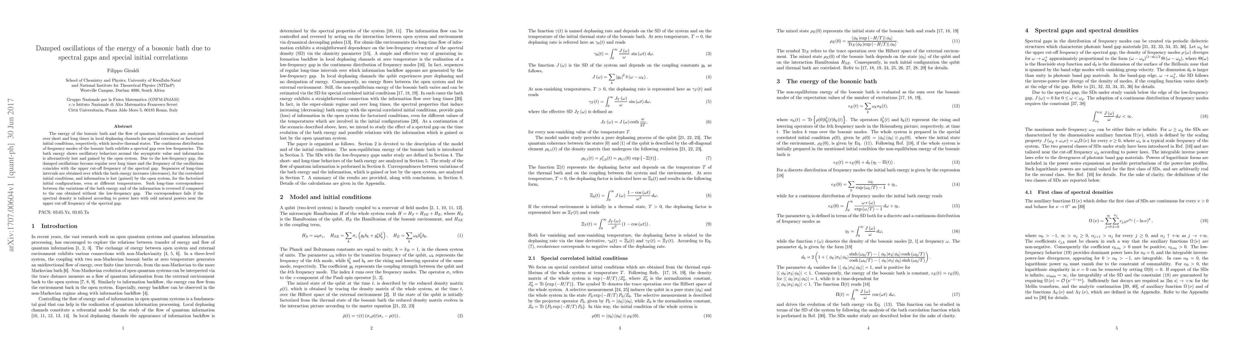 This paper investigates the damped oscillations of a bosonic bath's energy and quantum information flow in local dephasing channels, revealing regular oscillations due to a spectral gap at low frequencies. The study finds that correlated initial conditions lead to energy increases and information loss, while factorized conditions do the opposite, with the correspondence reversing in the absence of a spectral gap.
