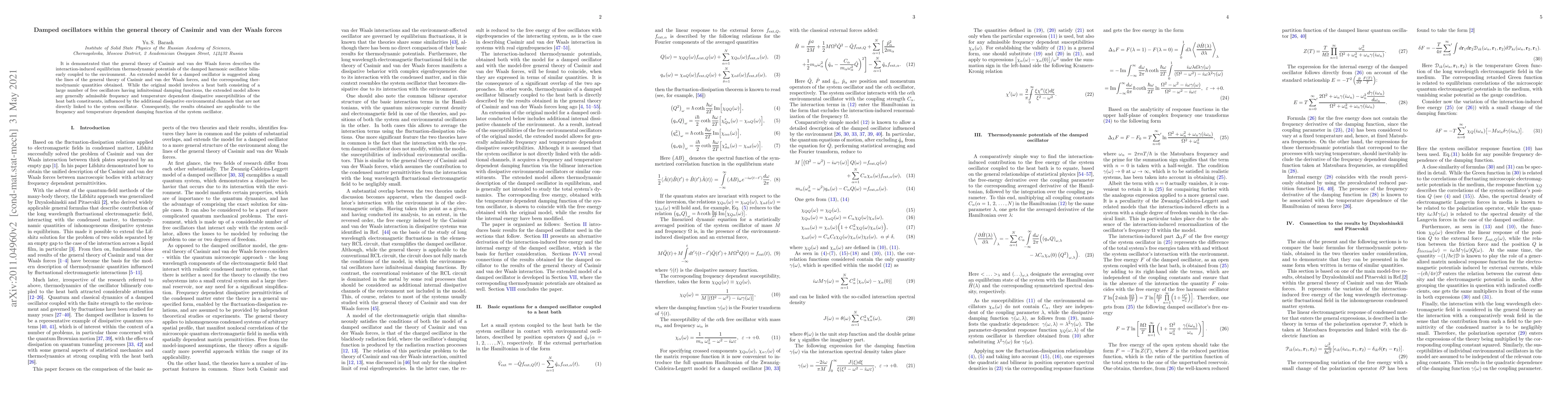 This paper extends the general theory of Casimir and van der Waals forces to describe damped harmonic oscillators coupled to their environment, providing a model that accommodates frequency and temperature-dependent dissipative susceptibilities of the heat bath, thus offering insights into the system's frequency and temperature dependent damping function.