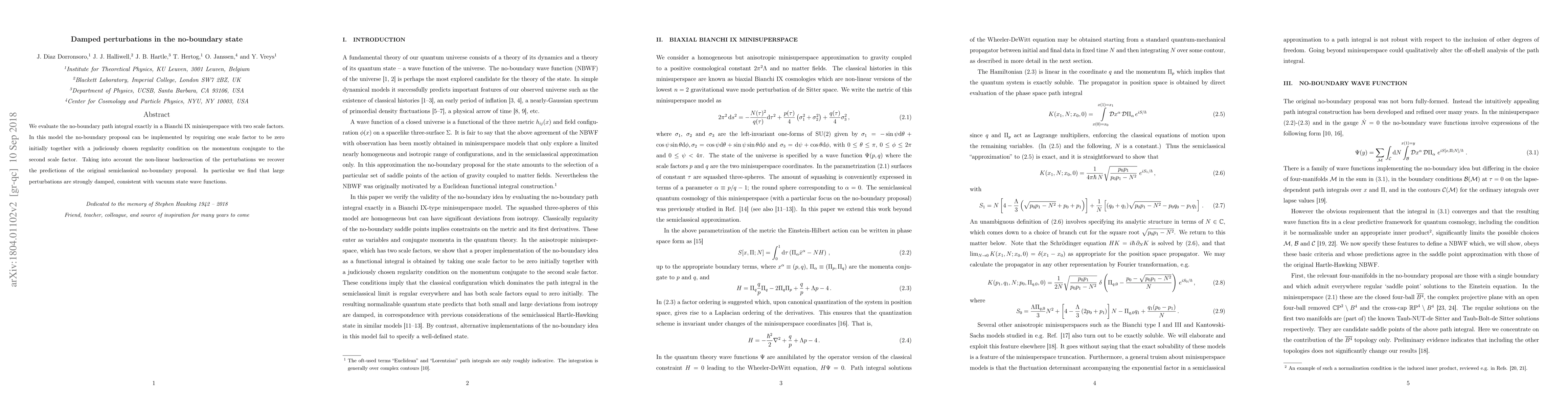 This paper evaluates the no-boundary path integral in a Bianchi IX minisuperspace model, finding that large perturbations are strongly damped, aligning with the predictions of the original semiclassical no-boundary proposal. The model requires one scale factor to be zero initially and a specific regularity condition on the momentum conjugate to the second scale factor.