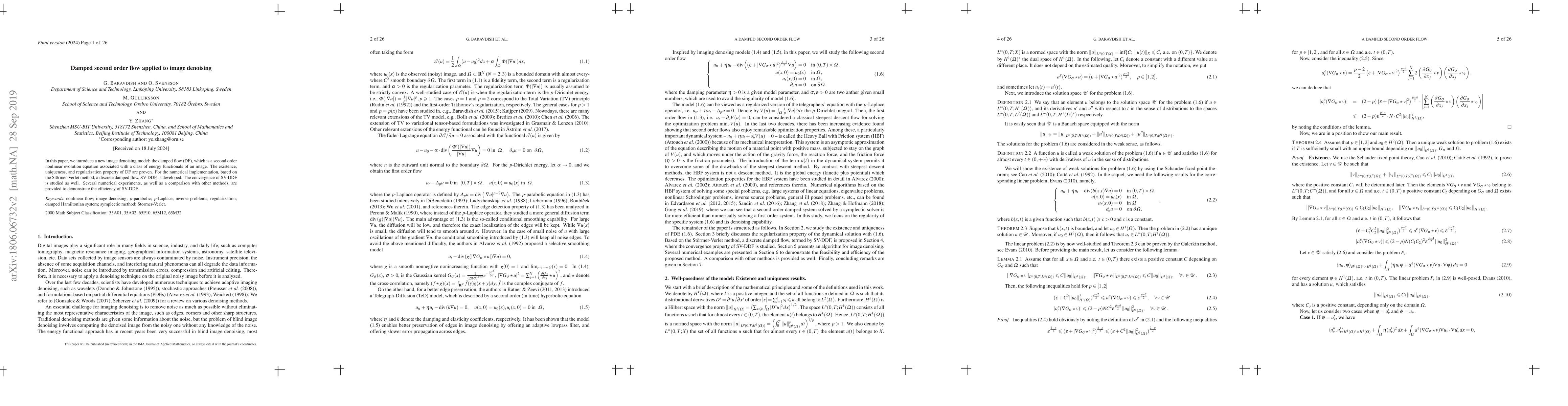 In this paper, we introduce a new image denoising model: the damped flow (DF), which is a second order nonlinear evolution equation associated with a class of energy functionals of image. The existence, uniqueness and regularization property of DF are proven. For the numerical implementation, based on the St\"{o}rmer-Verlet method, a discrete damped flow, SV-DDF, is developed. The convergence of SV-DDF is studied as well. Several numerical experiments, as well as a comparison with other methods, are provided to demonstrate the feasibility and effectiveness of the SV-DDF.