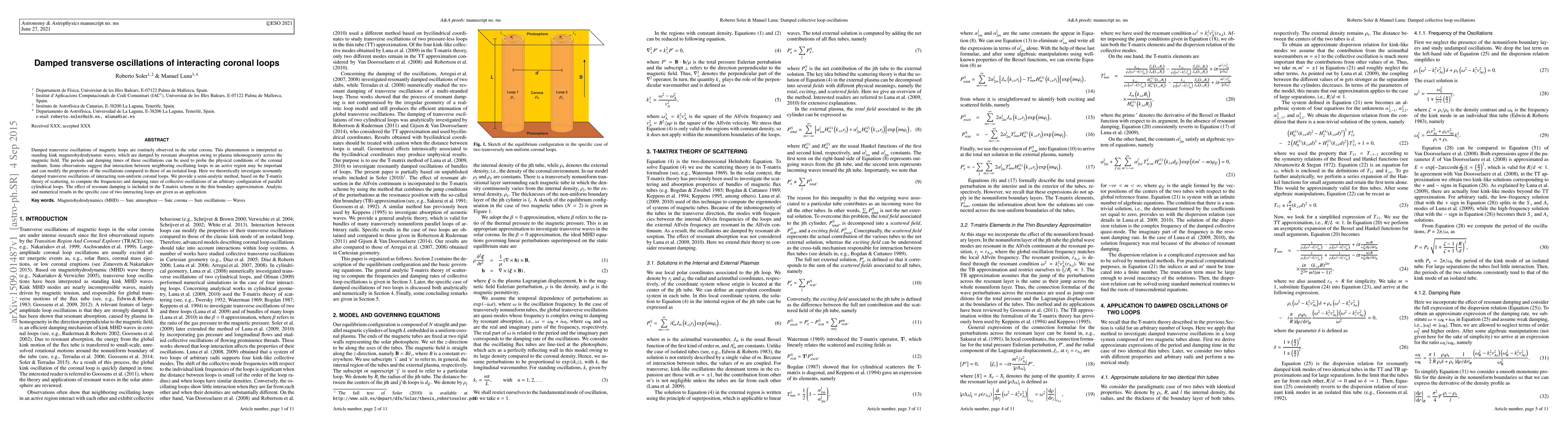This paper investigates the damped transverse oscillations in interacting coronal loops, using a semi-analytic method based on the T-matrix theory to compute oscillation frequencies and damping rates. It highlights the impact of resonant damping and loop interactions on the properties of these oscillations.