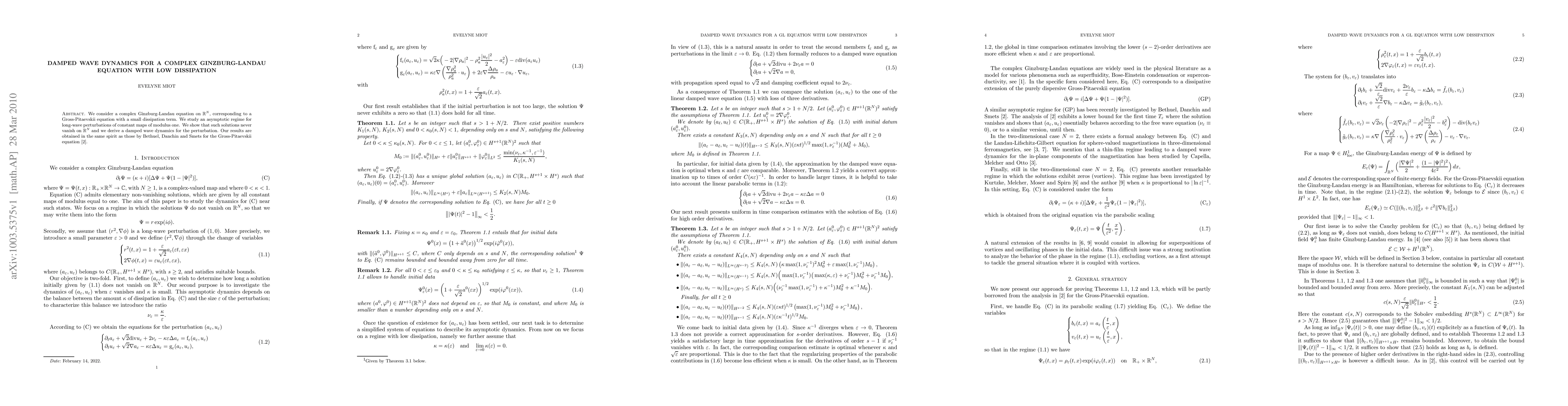 We consider a complex Ginzburg-Landau equation, corresponding to a Gross-Pitaevskii equation with a small dissipation term. We study an asymptotic regime for long-wave perturbations of constant maps of modulus one. We show that such solutions never vanish and we derive a damped wave dynamics for the perturbation.