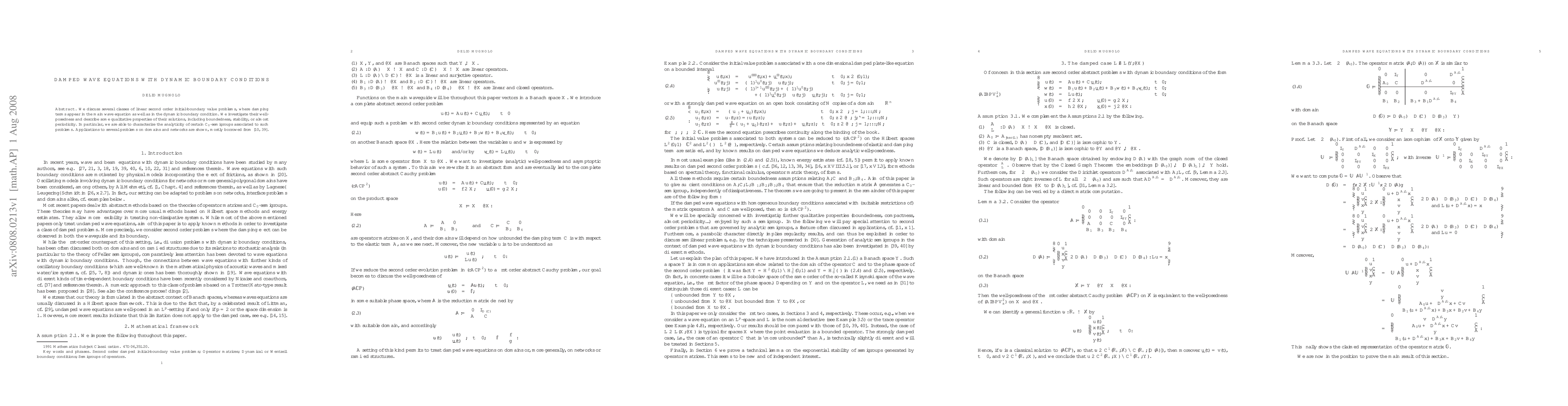 We discuss several classes of linear second order initial-boundary value problems, where damping terms appear in the main wave equation as well as in the dynamic boundary condition. We investigate their well-posedness and describe some qualitative properties of their solutions, including boundedness, stability, or almost periodicity. In particular, we are able to characterize the analyticity of certain $C_0$-semigroups associated to such problems. Applications to several problems on domains and networks are shown.