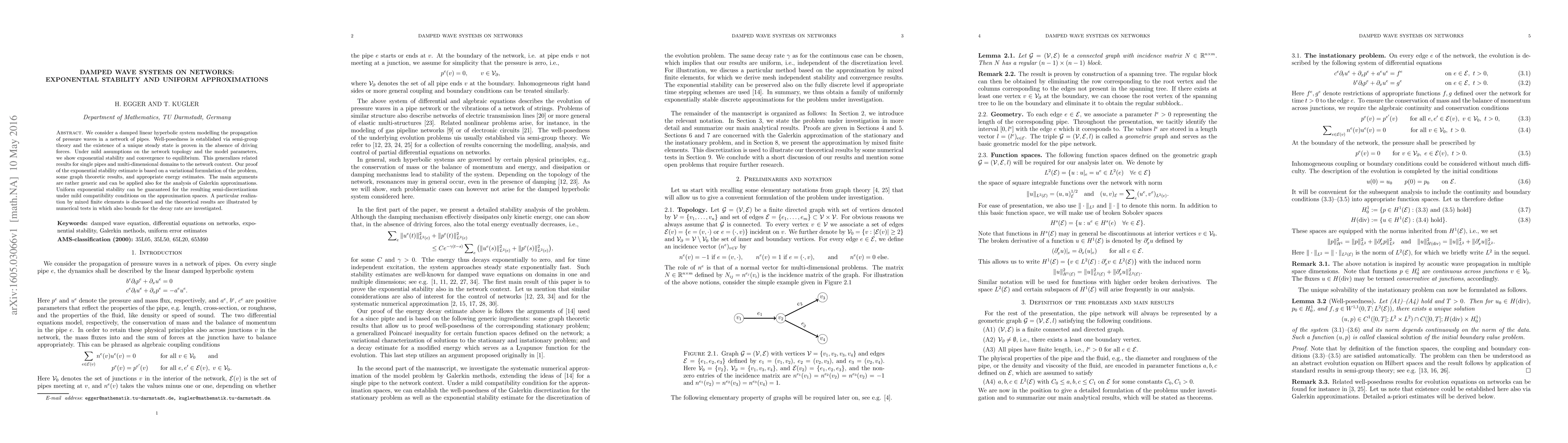 This paper studies a damped linear hyperbolic system modeling pressure waves in a network of pipes, proving exponential stability and uniform approximations. It generalizes stability results to networks and uses variational methods and graph theory for the analysis, with numerical tests validating the theoretical findings.