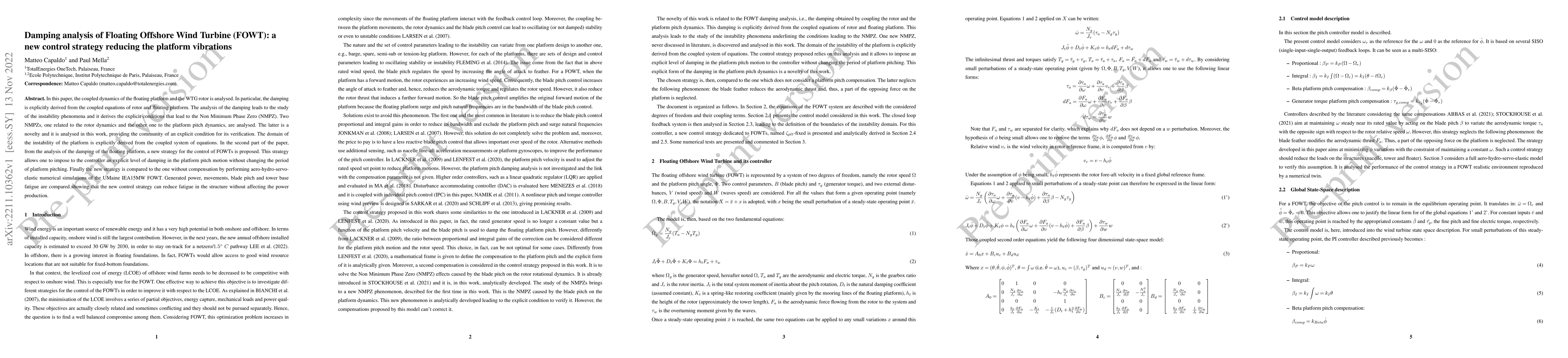 In this paper, the coupled dynamics of the floating platform and the WTG rotor is analysed. In particular, the damping is explicitly derived from the coupled equations of rotor and floating platform. The analysis of the damping leads to the study of the instability phenomena and it derives the explicit conditions that lead to the Non Minimum Phase Zero (NMPZ). Two NMPZs, one related to the rotor dynamics and the other one to the platform pitch dynamics, are analysed. The latter is a novelty and it is analysed in this work, providing the community of an explicit condition for its verification. The domain of the instability of the platform is explicitly derived from the coupled system of equations. In the second part of the paper, from the analysis of the damping of the floating platform, a new strategy for the control of FOWTs is proposed. This strategy allows one to impose to the controller an explicit level of damping in the platform pitch motion without changing the period of platform pitching. Finally the new strategy is compared to the one without compensation by performing aero-hydro-servo-elastic numerical simulations of the UMaine IEA15MW FOWT. Generated power, movements, blade pitch and tower base fatigue are compared showing that the new control strategy can reduce fatigue in the structure without affecting the power production.
