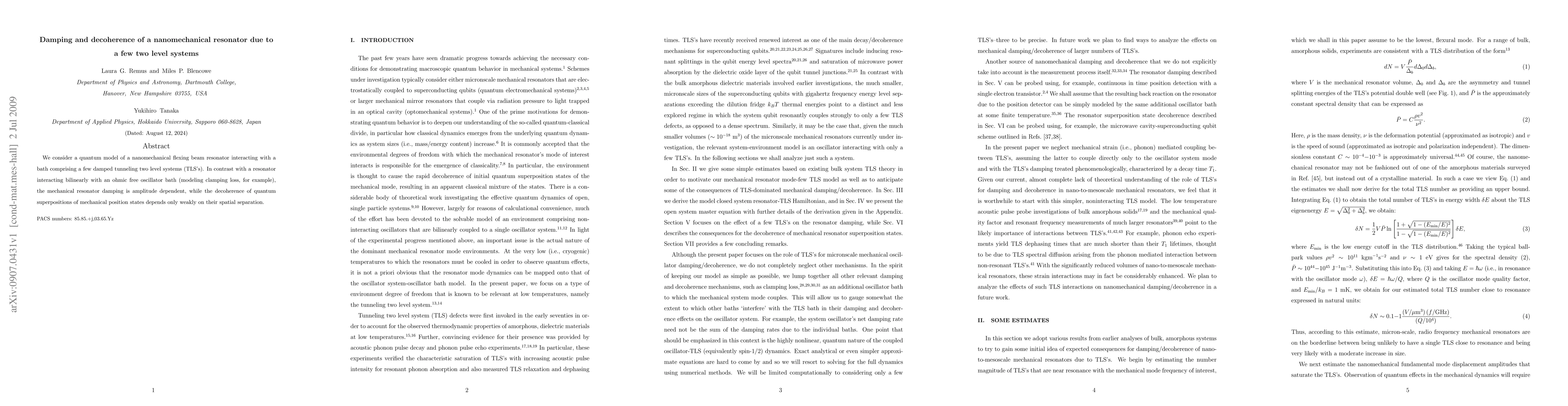 Summary: This paper investigates a quantum model of a nanomechanical resonator interacting with a few damped tunneling two-level systems, showing that the damping is amplitude-dependent, while decoherence of quantum superpositions is weakly dependent on spatial separation.