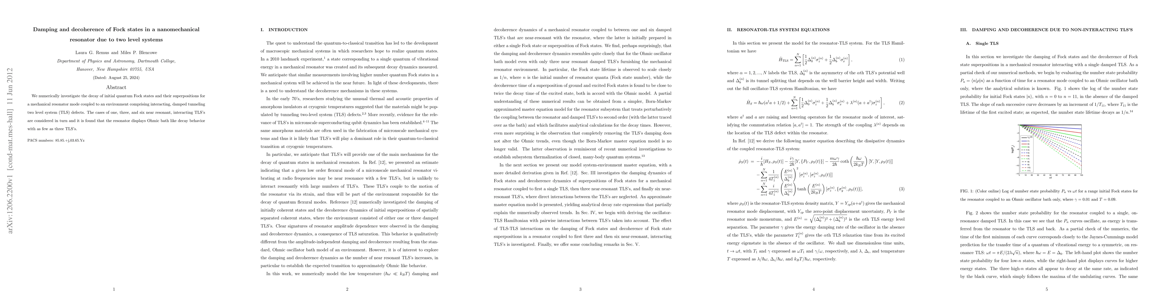 Summary: This study investigates the damping and decoherence of quantum Fock states in a nanomechanical resonator interacting with a system of tunneling two-level defects. The research finds that as few as three interacting TLSs can induce an Ohmic decay behavior in the resonator.