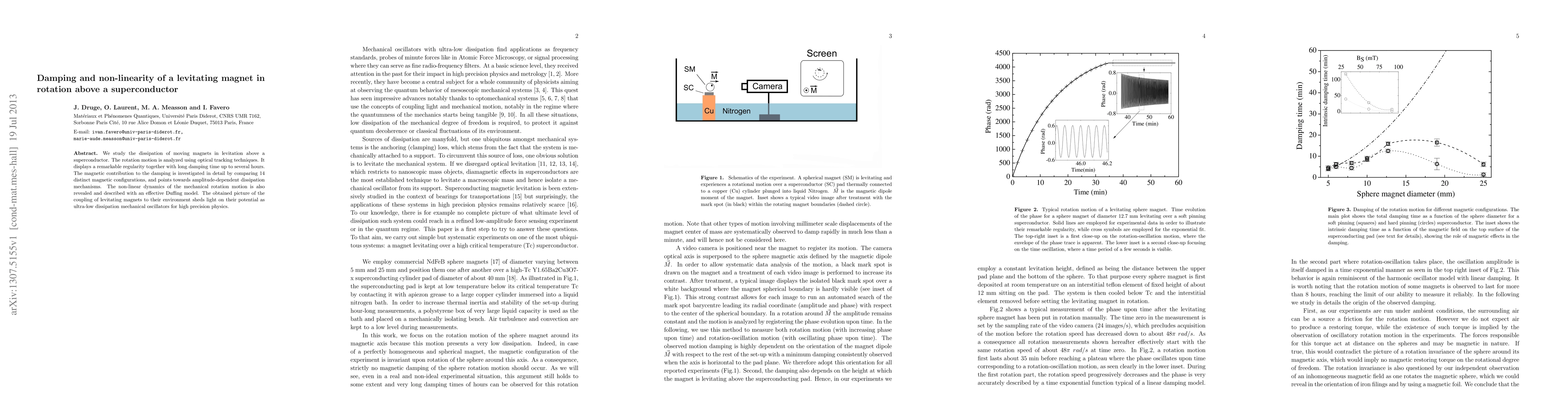 This research investigates the damping and non-linear dynamics of a rotating levitating magnet above a superconductor, revealing long damping times and amplitude-dependent dissipation mechanisms. An effective Duffing model describes the non-linear rotation motion, highlighting the potential for ultra-low dissipation in high precision physics applications.