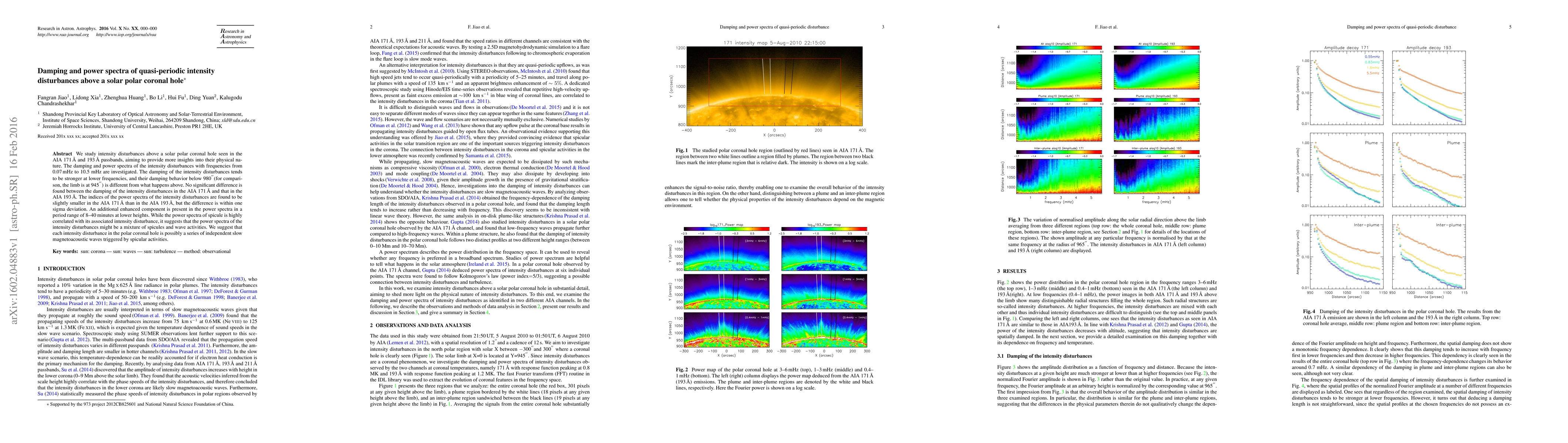 This study investigates intensity disturbances above a solar polar coronal hole in the AIA 171 Å and 193 Å passbands, finding stronger damping at lower frequencies and a distinct behavior below 980". The power spectra suggest a mixture of wave activities and spicules, indicating independent slow magnetoacoustic waves.