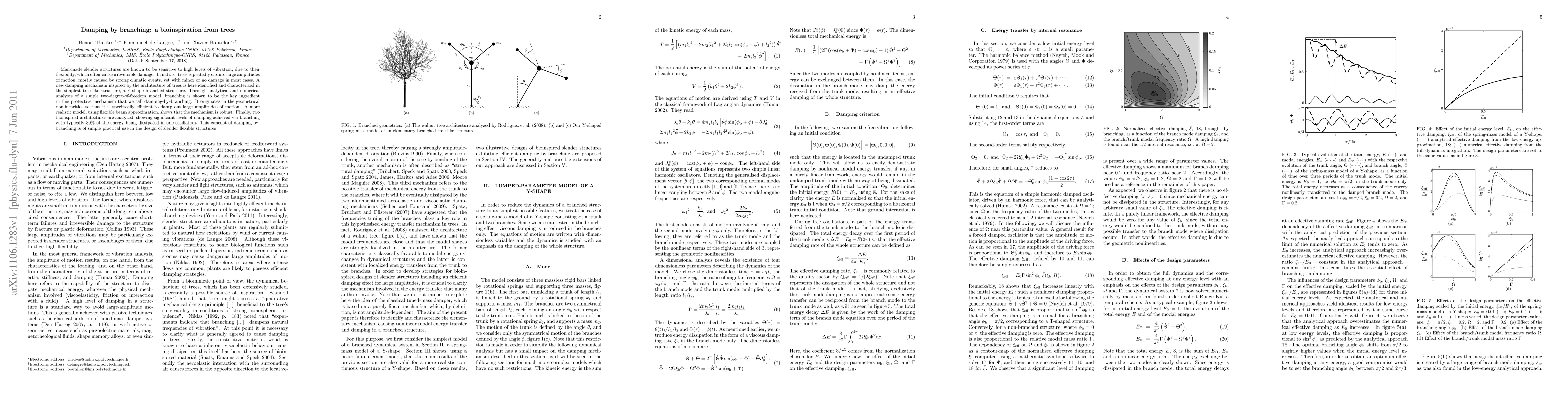 This paper identifies a novel damping mechanism, termed "damping-by-branching," inspired by the architecture of trees, which effectively mitigates large-amplitude vibrations in slender structures. Through analytical and numerical models, the study demonstrates that branching is crucial for this damping effect, which is robust and can dissipate up to 30% of oscillation energy, offering practical design benefits for flexible structures.