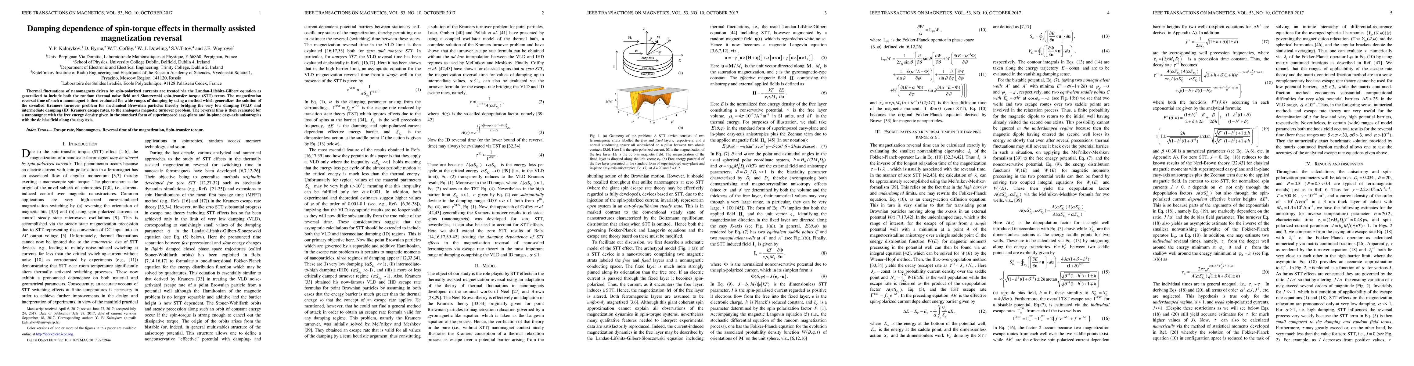 Thermal fluctuations of nanomagnets driven by spin-polarized currents are treated via the Landau-Lifshitz-Gilbert equation as generalized to include both the random thermal noise field and Slonczewski spin-transfer torque terms. The magnetization reversal time of such a nanomagnet is then evaluated for wide ranges of damping by using a method which generalizes the solution of the so-called Kramers turnover problem for mechanical Brownian particles, thereby bridging the very low damping and intermediate damping Kramers escape rates, to the analogous magnetic turnover problem. The reversal time is then evaluated for a nanomagnet with the free energy density given in the standard form of superimposed easy-plane and in-plane easy-axis anisotropies with the dc bias field along the easy axis.