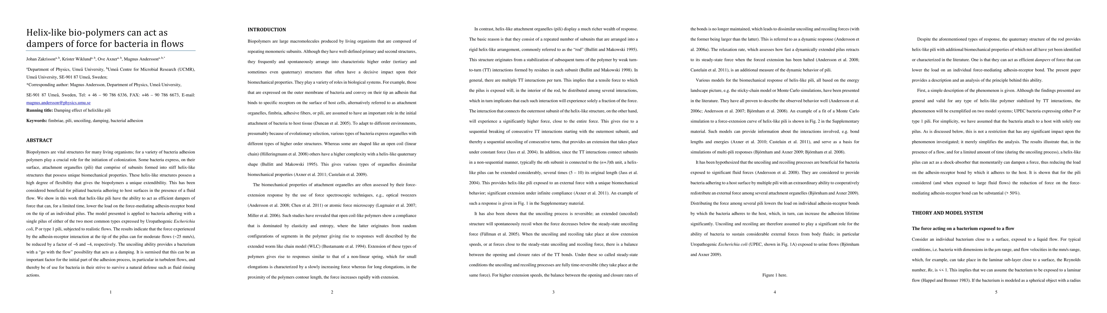 Biopolymers are vital structures for many living organisms; for a variety of bacteria, adhesion polymers play a crucial role for the initiation of colonization. Some bacteria express, on their surface, attachment organelles (pili) that comprise subunits formed into stiff helix-like structures that possess unique biomechanical properties. These helix-like structures possess a high degree of flexibility that gives the biopolymers a unique extendibility. This has been considered beneficial for piliated bacteria adhering to host surfaces in the presence of a fluid flow. We show in this work that helix-like pili have the ability to act as efficient dampers of force that can, for a limited time, lower the load on the force-mediating adhesin-receptor bond on the tip of an individual pilus. The model presented is applied to bacteria adhering with a single pilus of either of the two most common types expressed by uropathogenic Escherichia coli, P or type 1 pili, subjected to realistic flows. The results indicate that for moderate flows (~25 mm/s) the force experienced by the adhesin-receptor interaction at the tip of the pilus can be reduced by a factor of ~6 and ~4, respectively. The uncoiling ability provides a bacterium with a "go with the flow" possibility that acts as a damping. It is surmised that this can be an important factor for the initial part of the adhesion process, in particular in turbulent flows, and thereby be of use for bacteria in their striving to survive a natural defense such as fluid rinsing actions.