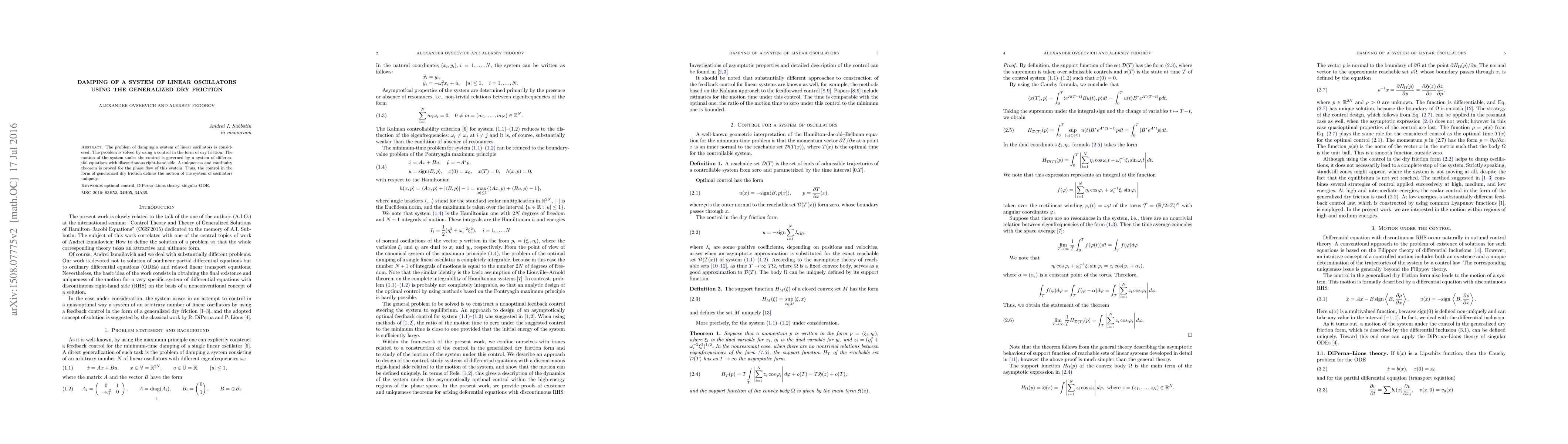 This paper addresses damping in a system of linear oscillators through the application of generalized dry friction control. It demonstrates that this control method uniquely determines the system's motion, supported by a proven uniqueness and continuity theorem for the phase flow.
