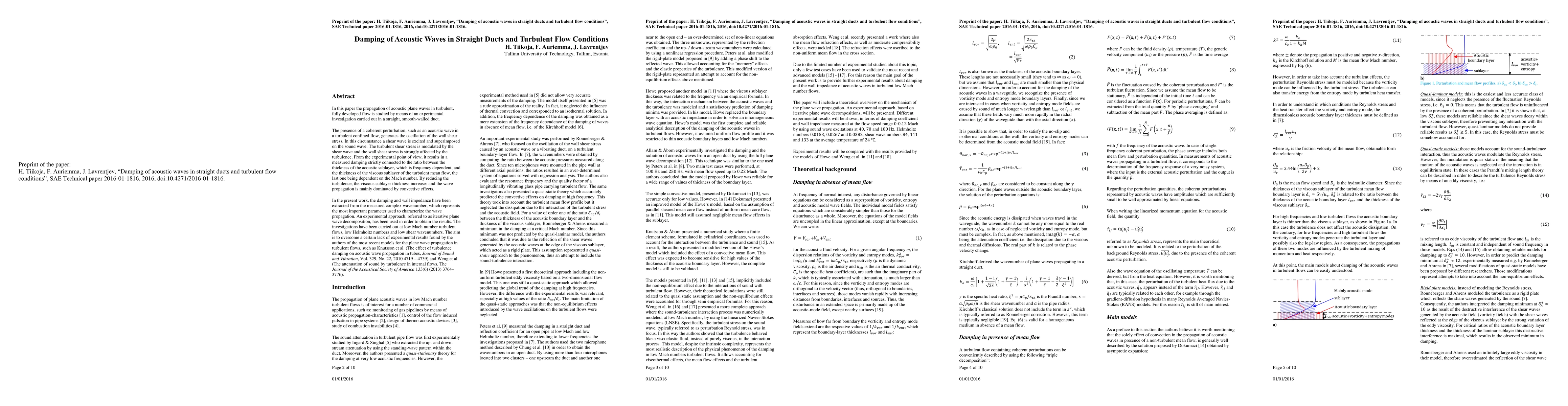 In this paper the propagation of acoustic plane waves in turbulent, fully developed flow is studied by means of an experimental investigation carried out in a straight, smooth-walled duct.The presence of a coherent perturbation, such as an acoustic wave in a turbulent confined flow, generates the oscillation of the wall shear stress. In this circumstance a shear wave is excited and superimposed on the sound wave. The turbulent shear stress is modulated by the shear wave and the wall shear stress is strongly affected by the turbulence. From the experimental point of view, it results in a measured damping strictly connected to the ratio between the thickness of the acoustic sublayer, which is frequency dependent, and the thickness of the viscous sublayer of the turbulent mean flow, the last one being dependent on the Mach number. By reducing the turbulence, the viscous sublayer thickness increases and the wave propagation is mainly dominated by convective effects. In the present work, the damping and wall impedance have been extracted from the measured complex wavenumber, which represents the most important parameter used to characterize the wave propagation. An experimental approach, referred to as iterative plane wave decomposition, has been used in order to obtain the results. The investigations have been carried out at low Mach number turbulent flows, low Helmholtz numbers and low shear wavenumbers. The aim is to overcome a certain lack of experimental results found by the authors of the most recent models for the plane wave propagation in turbulent flows, such as Knutsson et al. (The effect of turbulence damping on acoustic wave propagation in tubes, Journal of Sound and Vibration, Vol. 329, No. 22, 2010), and Weng et al. (The attenuation of sound by turbulence in internal flows, The Journal of the Acoustical Society of America 133(6), 2013).