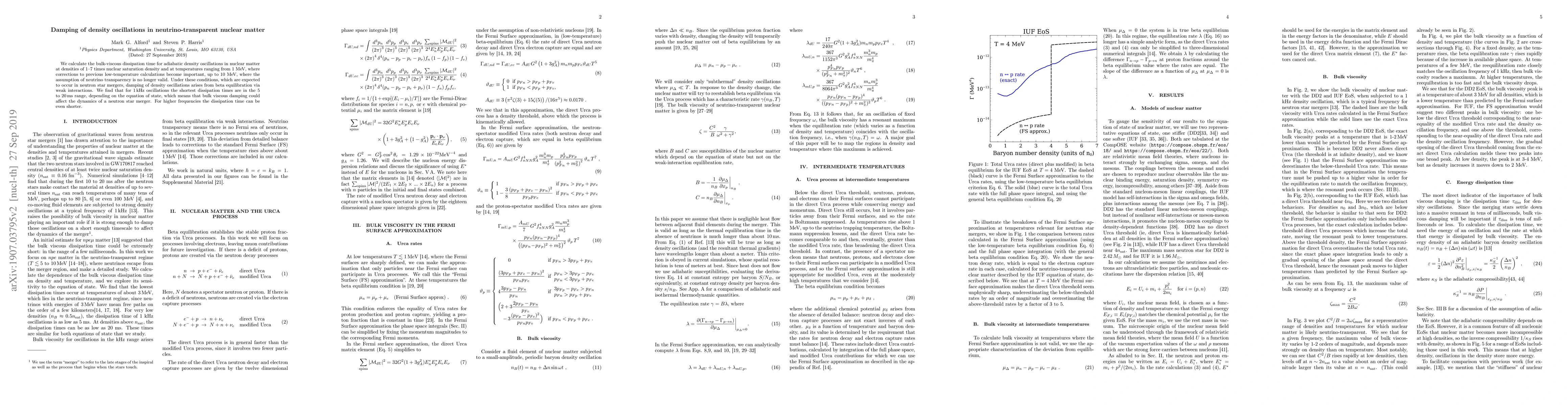 This study calculates the bulk-viscous dissipation time for density oscillations in nuclear matter during neutron star mergers, finding that beta equilibration via weak interactions can significantly dampen oscillations within 5 to 20 ms. Higher frequency oscillations experience even shorter damping times.
