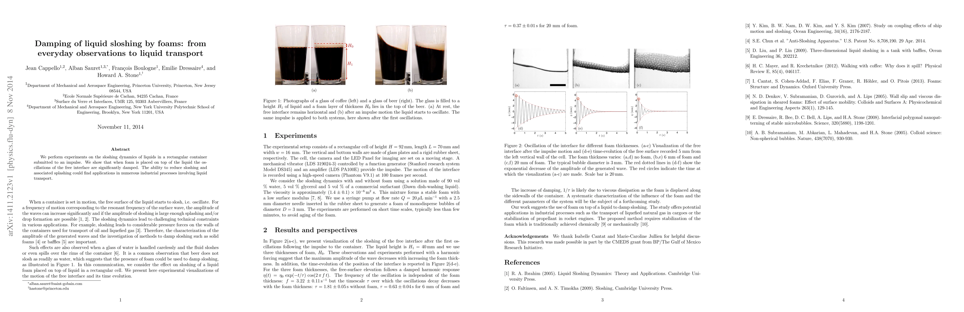 We perform experiments on the sloshing dynamics of liquids in a rectangular container submitted to an impulse. We show that when foam is placed on top of the liquid the oscillations of the free interface are significantly damped. The ability to reduce sloshing and associated splashing could find applications in numerous industrial processes involving liquid transport.